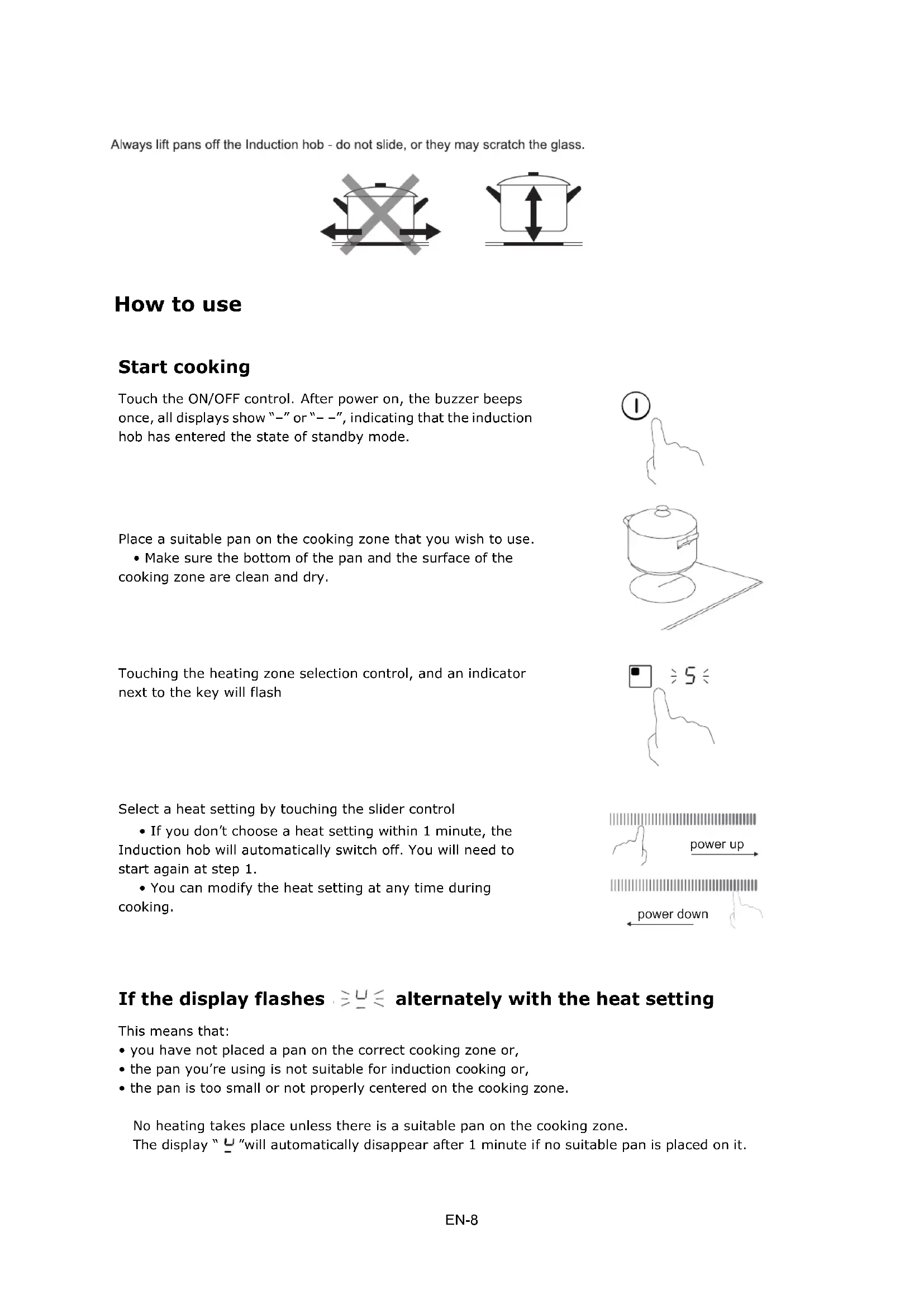EN-6EN-7How to use Start cooking Touch the ON/OFF control. After power on, the buzzer beeps once, all displays show “–” or “– –”, indicating that the induction hob has entered the state of standby mode. Place a suitable pan on the cooking zone that you wish to use.