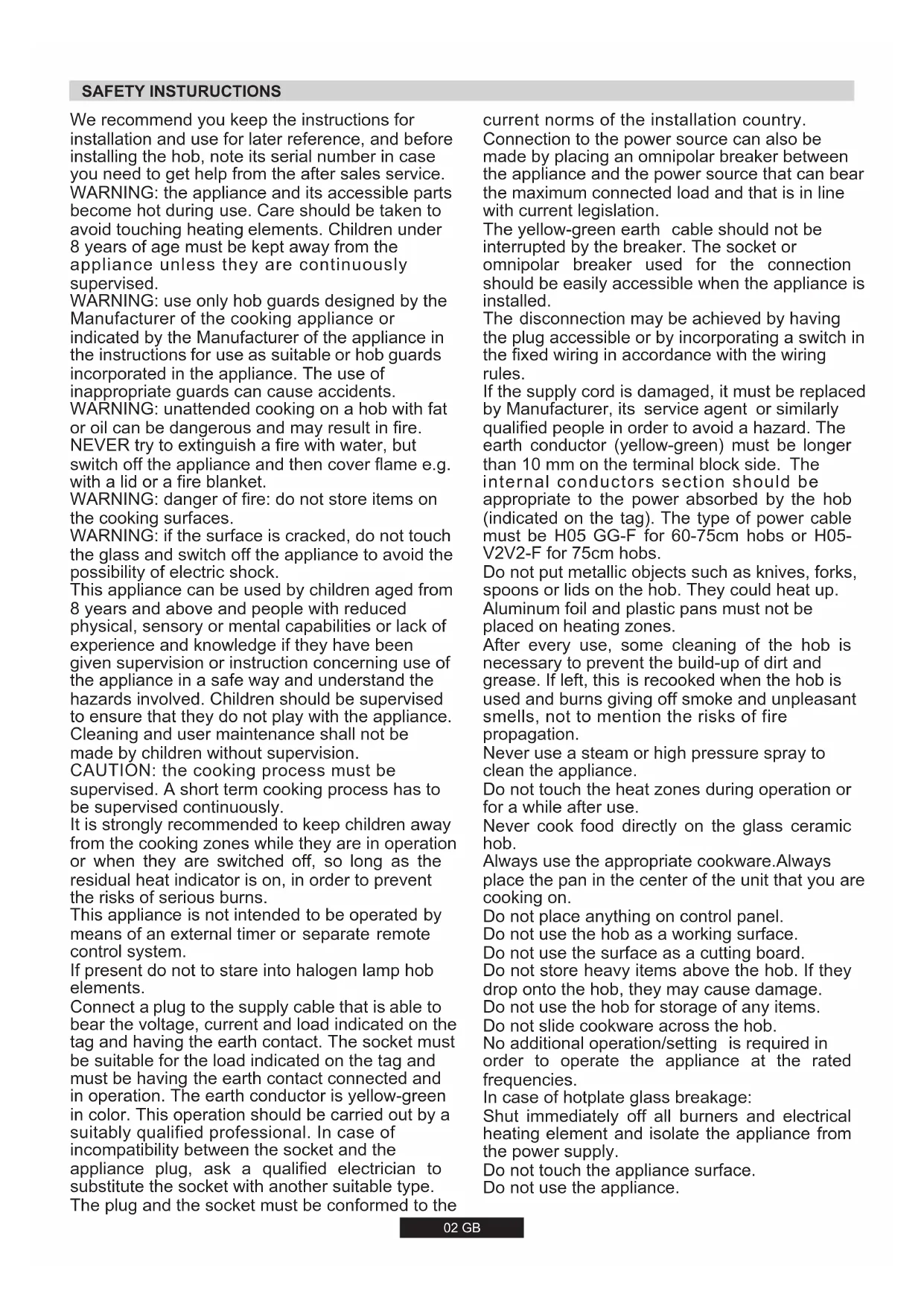 0602 GB SAFETY INSTURUCTIONS We recommend you keep the instructions for installation and use for later reference, and before installing the hob, note its serial number in case you need to get help from the after sales service.