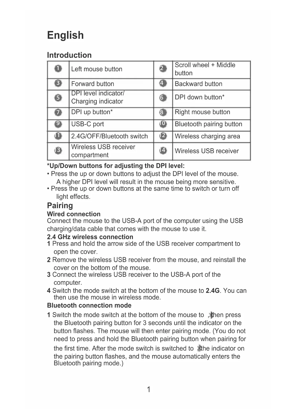 1 Press and hold the arrow side of the USB receiver compartment to open the cover. 2 Remove the wireless USB receiver from the mouse, and reinstall the cover on the bottom of the mouse. 3 Connect the wireless USB receiver to the USB-A port of the computer. 4 Switch the mode switch at the bottom of the mouse to 2.4G. You can then use the mouse in wireless mode. Bluetooth connection mode 1 Switch the mode switch at the bottom of the mouse to , then press the Bluetooth pairing button for 3 seconds until the indicator on the button flashes. The mouse will then enter pairing mode. (You do not need to press and hold the Bluetooth pairing button when pairing for the first time. After the mode switch is switched to , the indicator on the pairing button flashes, and the mouse automatically enters the Bluetooth pairing mode.) 12 Initiate the Bluetooth pairing on the Bluetooth device. After the pairing is complete, you can use the mouse in Bluetooth connection mode. The mouse can only work with devices that run Windows 7 or later, Android 5.0 or later, and macOS 10.10 or later. Certain Android and macOS models may not be compatible with the Bluetooth mouse. Charging The mouse has a built-in (irremovable) rechargeable battery that supports wired and wireless charging. Wired charging To charge the mouse, connect it to the USB-A port of the computer or a power adapter using the USB charging/data cable that comes with the mouse. Wireless charging The mouse is compatible with the Qi wireless charging standard. The mouse can be charged by placing the mouse on the wireless charging panel and aligning the wireless charging area at the bottom of the mouse with the wireless charging area on the wireless charging panel. The wireless charging panel needs to be purchased separately. More functions Visit https://consumer.huawei.com/en/support/ , search for your device name, then download and install the mouse driver to start exploring more mouse functions. Safety information
