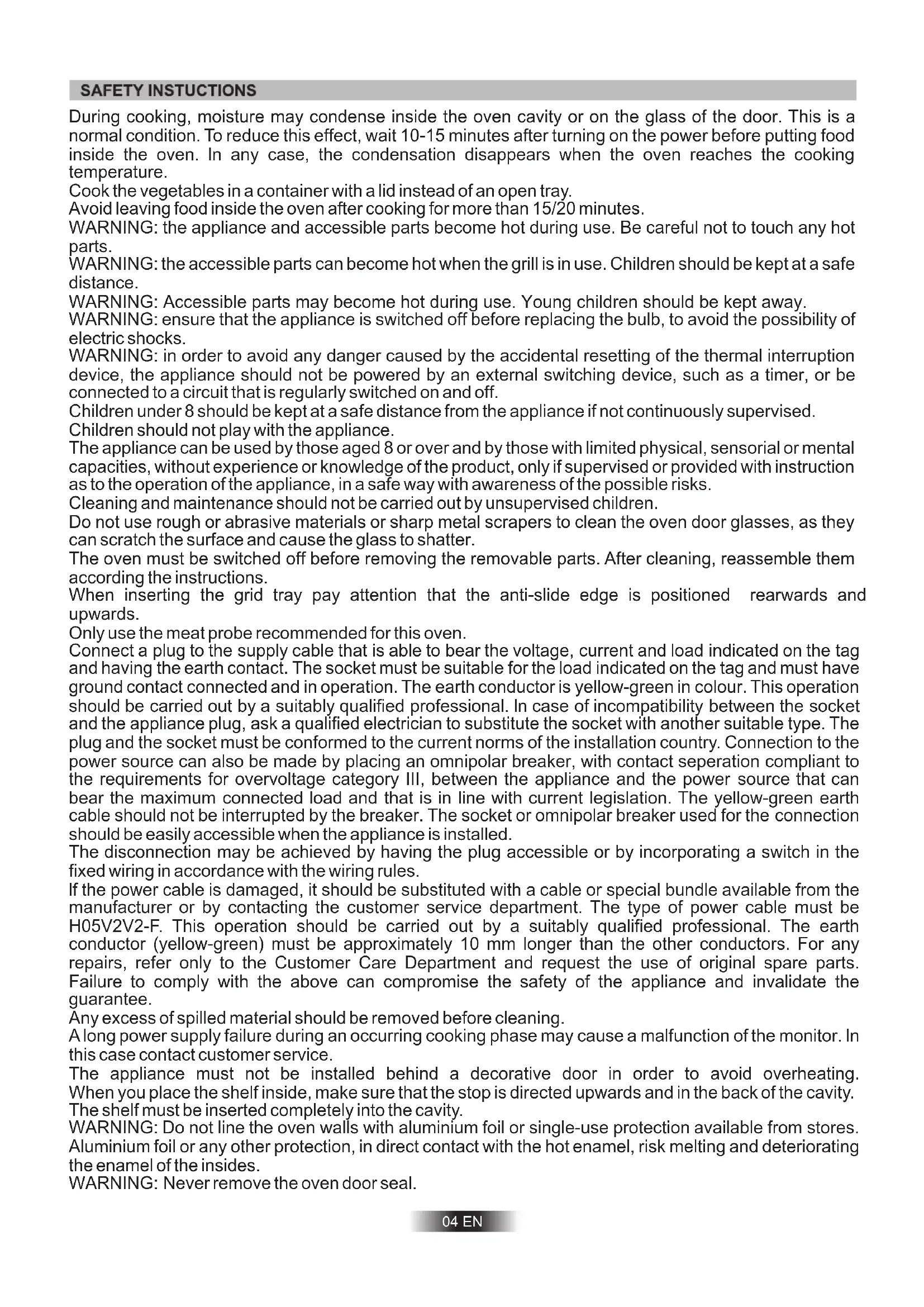 device, the appliance should not be powered by an external switching device, such as a timer, or be connected to a circuit that is regularly switched on and off. Children under 8 should be kept at a safe distance from the appliance if not continuously supervised. Children should not play with the appliance. The appliance can be used by those aged 8 or over and by those with limited physical, sensorial or mental capacities, without experience or knowledge of the product, only if supervised or provided with instruction as to the operation of the appliance, in a safe way with awareness of the possible risks. Cleaning and maintenance should not be carried out by unsupervised children. Do not use rough or abrasive materials or sharp metal scrapers to clean the oven door glasses, as they can scratch the surface and cause the glass to shatter. The oven must be switched off before removing the removable parts. After cleaning, reassemble them according the instructions. When inserting the grid tray pay attention that the anti-slide edge is positioned rearwards and upwards. Only use the meat probe recommended for this oven. Connect a plug to the supply cable that is able to bear the voltage, current and load indicated on the tag and having the earth contact. The socket must be suitable for the load indicated on the tag and must have ground contact connected and in operation. The earth conductor is yellow-green in colour. This operation should be carried out by a suitably qualified professional. ln case of incompatibility between the socket and the appliance plug, ask a qualified electrician to substitute the socket with another suitable type. The plug and the socket must be conformed to the current norms of the installation country. Connection to the power source can also be made by placing an omnipolar breaker, with contact seperation compliant to the requirements for overvoltage category III, between the appliance and the power source that can bear the maximum connected load and that is in line with current legislation. The yellow-green earth cable should not be interrupted by the breaker. The socket or omnipolar breaker used for the connection should be easily accessible when the appliance is installed. The disconnection may be achieved by having the plug accessible or by incorporating a switch in the fixed wiring in accordance with the wiring rules. lf the power cable is damaged, it should be substituted with a cable or special bundle available from the manufacturer or by contacting the customer service department. The type of power cable must be H05V2V2-F. This operation should be carried out by a suitably qualified professional. The earth conductor (yellow-green) must be approximately 10 mm longer than the other conductors. For any repairs, refer only to the Customer Care Department and request the use of original spare parts. Failure to comply with the above can compromise the safety of the appliance and invalidate the guarantee. Any excess of spilled material should be removed before cleaning. A long power supply failure during an occurring cooking phase may cause a malfunction of the monitor. ln this case contact customer service. The appliance must not be installed behind a decorative door in order to avoid overheating. When you place the shelf inside, make sure that the stop is directed upwards and in the back of the cavity. The shelf must be inserted completely into the cavity.