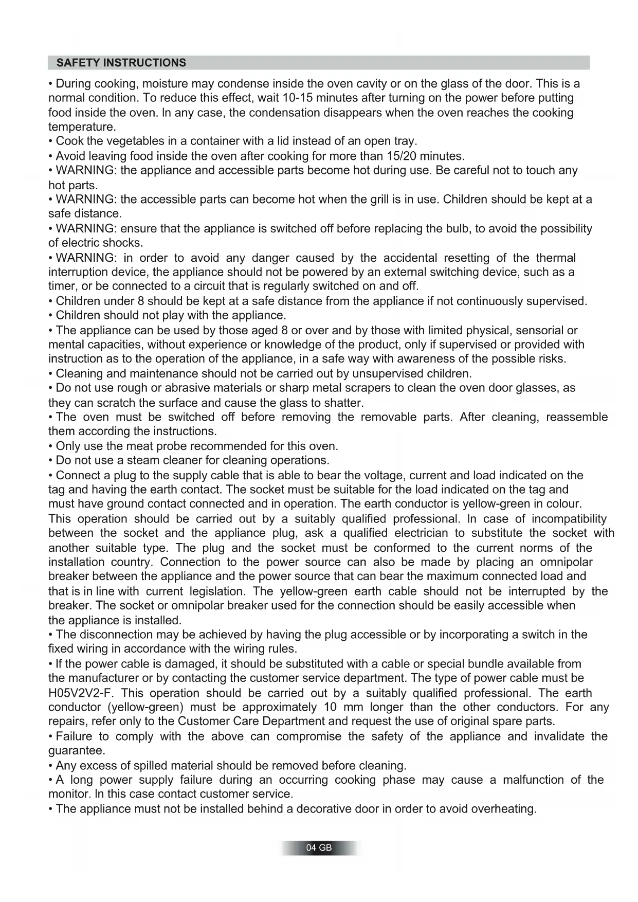 Plug into the power supply. Ensure first that there is a third contact that acts as earthing for the oven. The oven must be properly earthed. If the model of oven is not fitted with a plug, fit a standard plug to the power cable. It must be able to bear the power supply indicated on the specifications plate. The earthing cable is yellowgreen. The plug must be fitted by a properly qualified person. If the socket and the plug are incompatible the socket must be changed by a properly qualified person.A properly qualified person must also ensure that the power cables can carry the current required to operate the oven. An ON/OFF switch may also be connected to the power supply. The connections must take account of the current supplied and must comply with current legal requirements. The yellow-green earthing cable must not be governed by the ON/OFF switch. The socket or the ON/OFF switch used for connecting to the power supply must be easily accessible when the oven has been installed. Important: During installation, position the power cable in such a way that it will not be subjected to temperatures of above 50°C at any point. The oven complies with safety standards set by the regulatory bodies. The oven is safe to use only if it has been adequately earthed in compliance with current legal requirements on wiring safety. You must ensure that the oven has been adequately earthed. The manufacturers cannot be held responsible for any harm or injury to persons, animals or belongings caused by failure to properly earth the oven. The cabling and wiring system must be able to bear the maximum electric power required by the oven. This is indicated on the specifications plate. If you are in any doubt at all, use the services of a professionally qualified person.