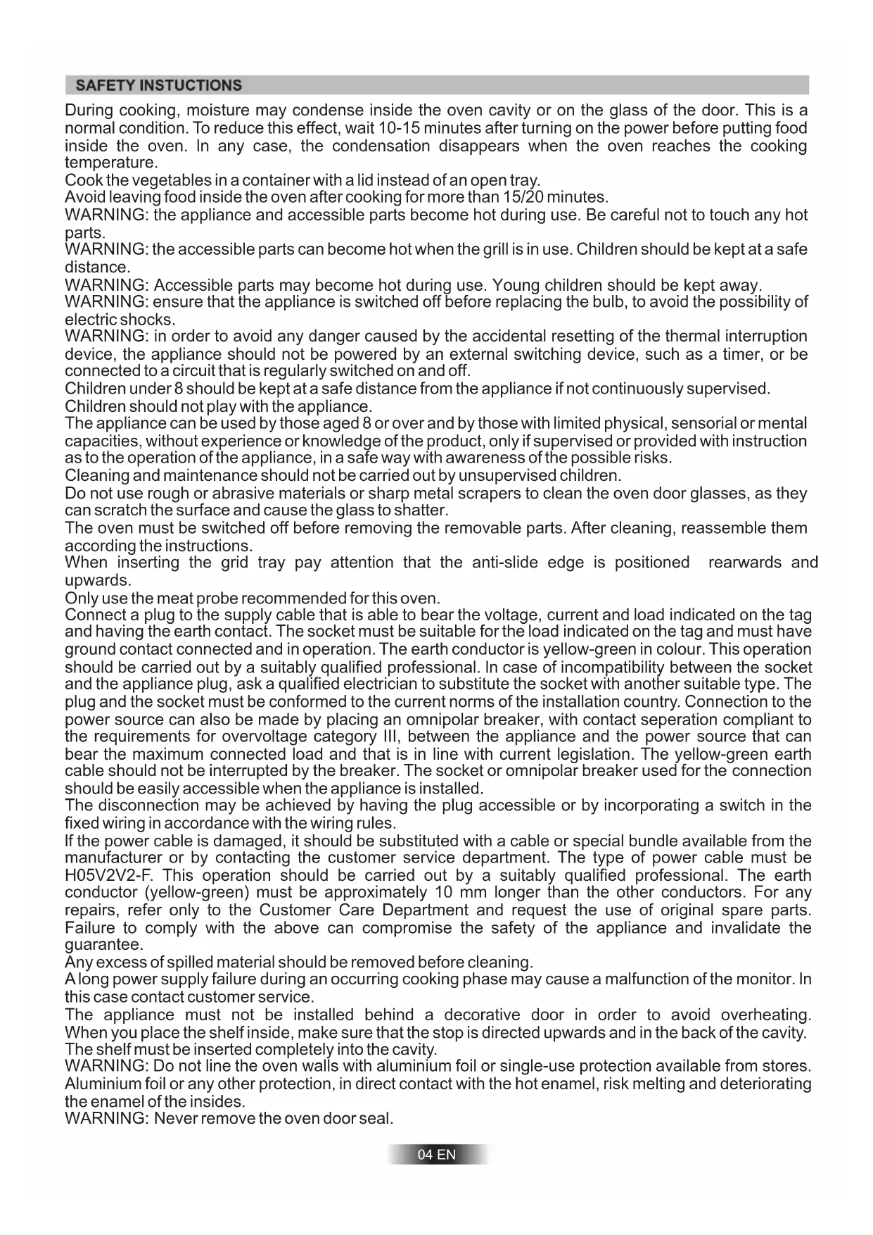device, the appliance should not be powered by an external switching device, such as a timer, or be connected to a circuit that is regularly switched on and off. Children under 8 should be kept at a safe distance from the appliance if not continuously supervised. Children should not play with the appliance. The appliance can be used by those aged 8 or over and by those with limited physical, sensorial or mental capacities, without experience or knowledge of the product, only if supervised or provided with instruction as to the operation of the appliance, in a safe way with awareness of the possible risks. Cleaning and maintenance should not be carried out by unsupervised children. Do not use rough or abrasive materials or sharp metal scrapers to clean the oven door glasses, as they can scratch the surface and cause the glass to shatter. The oven must be switched off before removing the removable parts. After cleaning, reassemble them according the instructions. When inserting the grid tray pay attention that the anti-slide edge is positioned rearwards and upwards. Only use the meat probe recommended for this oven. Connect a plug to the supply cable that is able to bear the voltage, current and load indicated on the tag and having the earth contact. The socket must be suitable for the load indicated on the tag and must have ground contact connected and in operation. The earth conductor is yellow-green in colour. This operation should be carried out by a suitably qualified professional. ln case of incompatibility between the socket and the appliance plug, ask a qualified electrician to substitute the socket with another suitable type. The plug and the socket must be conformed to the current norms of the installation country. Connection to the power source can also be made by placing an omnipolar breaker, with contact seperation compliant to the requirements for overvoltage category III, between the appliance and the power source that can bear the maximum connected load and that is in line with current legislation. The yellow-green earth cable should not be interrupted by the breaker. The socket or omnipolar breaker used for the connection should be easily accessible when the appliance is installed. The disconnection may be achieved by having the plug accessible or by incorporating a switch in the fixed wiring in accordance with the wiring rules. lf the power cable is damaged, it should be substituted with a cable or special bundle available from the manufacturer or by contacting the customer service department. The type of power cable must be H05V2V2-F. This operation should be carried out by a suitably qualified professional. The earth conductor (yellow-green) must be approximately 10 mm longer than the other conductors. For any repairs, refer only to the Customer Care Department and request the use of original spare parts. Failure to comply with the above can compromise the safety of the appliance and invalidate the guarantee. Any excess of spilled material should be removed before cleaning. A long power supply failure during an occurring cooking phase may cause a malfunction of the monitor. ln this case contact customer service. The appliance must not be installed behind a decorative door in order to avoid overheating. When you place the shelf inside, make sure that the stop is directed upwards and in the back of the cavity. The shelf must be inserted completely into the cavity.