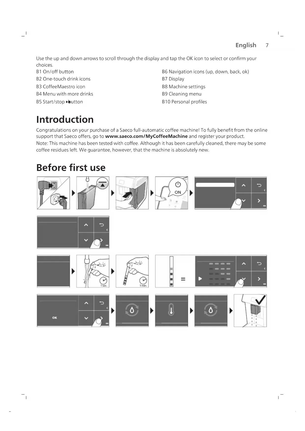 English Contents Machine overview (Fig. A)__________________________________________________________________ 6 Control panel_____________________________________________________________________________ 6 Introduction _____________________________________________________________________________ 7 Before first use ___________________________________________________________________________ 7 Special functions__________________________________________________________________________ 8 Brewing drinks ___________________________________________________________________________ 8 Personalizing drinks _______________________________________________________________________ 10 Adjusting machine settings_________________________________________________________________ 11 AquaClean water filter ____________________________________________________________________ 12 Removing and inserting the brew group _____________________________________________________ 13 Cleaning and maintenance_________________________________________________________________ 14 Descaling procedure ______________________________________________________________________ 16 Error codes_______________________________________________________________________________ 17 Ordering accessories ______________________________________________________________________ 18 Troubleshooting __________________________________________________________________________ 18 Technical specifications ____________________________________________________________________ 23 Machine overview (Fig. A) A1 Control panel A2 Lid of pre-ground coffee compartment A3 Lid of bean hopper A4 Socket for cord A5 Drip tray A6 Drip tray release grip A7 Adjustable coffee and milk dispensing spout A8 HygieSteam container A9 HygieSteam cover with milk tube holder A10 Internal cappuccinatore A11 Mains cord with plug A12 Grind setting knob A13 Bean hopper A14 Brew group A15 Service door A16 Water tank A17 Coffee grounds container A18 Front panel of coffee grounds container A19 Drip tray cover A20 'Drip tray full' indicator Accessories A21 Milk container A22 Milk tube A23 Cleaning brush A24 Grease tube A25 AquaClean filter A26 Measuring spoon A27 Water hardness test strip Control panel There are two versions of this espresso machine. Their control panels look different, but all buttons and icons work in the same way. Refer to figure B for an overview of all buttons and icons. Below you find the description.7 English Use the up and down arrows to scroll through the display and tap the OK icon to select or confirm your choices. B1 On/off button B2 One-touch drink icons B3 CoffeeMaestro icon B4 Menu with more drinks B5 Start/stop button B6 Navigation icons (up, down, back, ok) B7 Display B8 Machine settings B9 Cleaning menu B10 Personal profiles Introduction Congratulations on your purchase of a Saeco full-automatic coffee machine! To fully benefit from the online support that Saeco offers, go to www.saeco.com/MyCoffeeMachine and register your product. Note: This machine has been tested with coffee. Although it has been carefully cleaned, there may be some coffee residues left. We guarantee, however, that the machine is absolutely new. Before first use