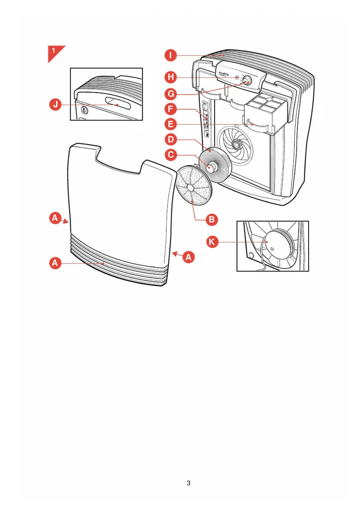 - Use mite-proof coverings and sheets to limit the amount of house dust allergens coming out of mattresses and blankets. How does the Philips air cleaner work? The air cleaner sucks in air though its front and both sides. The sucked-in air is filtered by the air cleaner. After filtering, clean air is blown out from the top of the appliance. To be able to remove even the smallest particles from the air, the air cleaner has been equipped with a unique three- stage filter system. 1 Prefilter The washable prefilter catches the larger airborne particles, such as fluff, hairs, etc. 2 Rota filter This rotating filter catches particles of down to 2 microns in size (for instance pollen). When a particle enters one of the ducts of the filter, it is pressed to the wall of the duct as a result of the centrifugal force. The air is allowed to pass through the duct while the particle remains behind in the filter. The Rota filter is washable. 3 HEPA filters Finally, the HEPA filters remove all remaining particles from the air, small particles in particular. The filter is made of glass fibres which are packed so closely together that they prevent even very small particles from passing through the filter. The same type of filter is also used in most operating rooms in hospitals. English Clean air in your house is a prerequisite for the prevention of inhalant allergies. Your Philips air cleaner will help you remove airborne particles from the air effectively. These particles also include allergens, such as house dust, pollen and pet allergens as well as viruses, bacteria and mould spores. When comparing air cleaners you will notice that a number of terms are used by suppliers as an indication of the effectiveness of their appliances. The standard that best reflects the effectiveness of an air cleaner is CADR (Clean Air Delivery Rate). In general, an air cleaner with a high CADR will remove particles from the air more quickly than an air cleaner with a low CADR.5 General description (fig. 1)