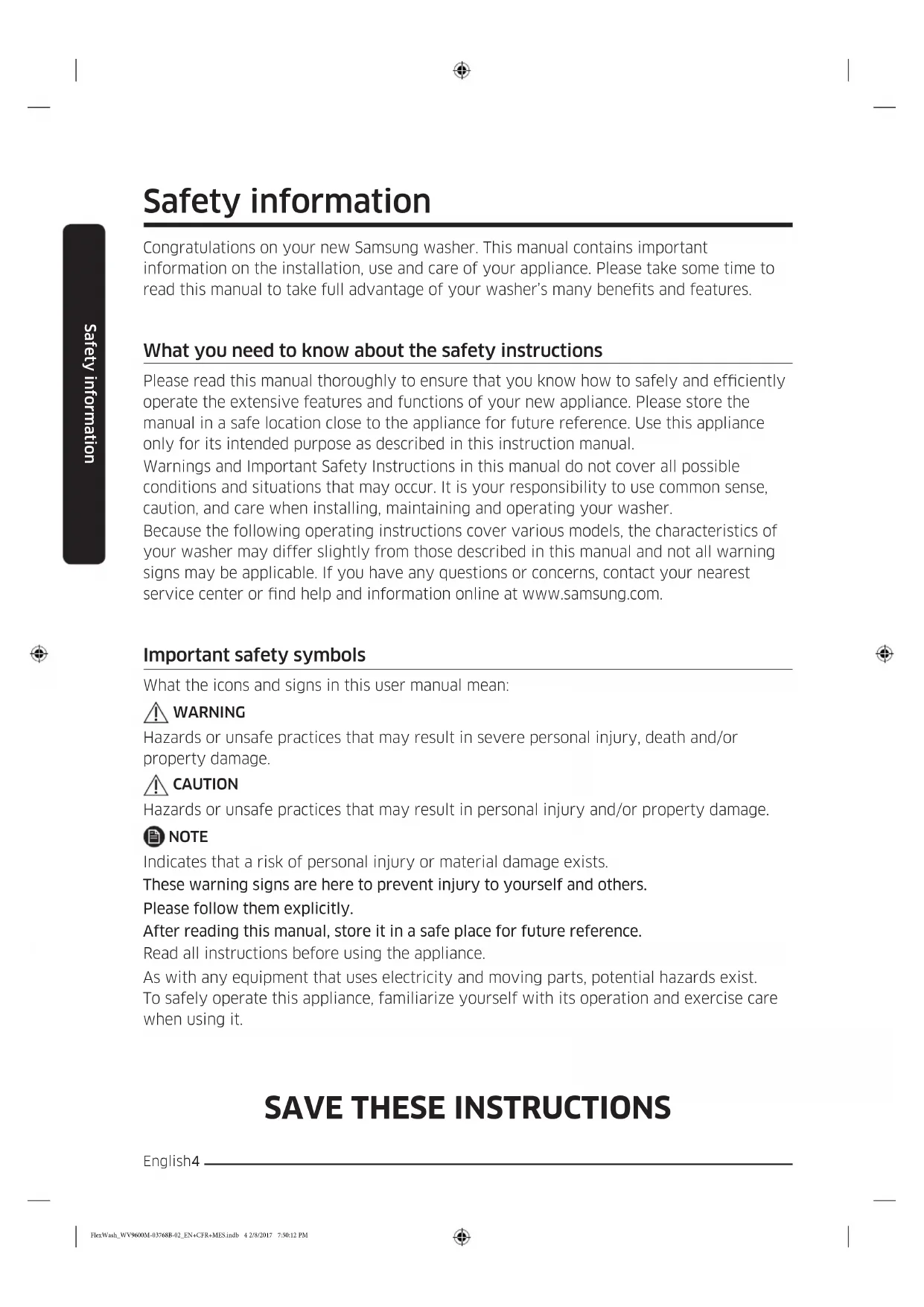 English4 Safety information Congratulations on your new Samsung washer. This manual contains important information on the installation, use and care of your appliance. Please take some time to read this manual to take full advantage of your washer’s many benets and features. What you need to know about the safety instructions Please read this manual thoroughly to ensure that you know how to safely and efciently operate the extensive features and functions of your new appliance. Please store the manual in a safe location close to the appliance for future reference. Use this appliance only for its intended purpose as described in this instruction manual. Warnings and Important Safety Instructions in this manual do not cover all possible conditions and situations that may occur. It is your responsibility to use common sense, caution, and care when installing, maintaining and operating your washer. Because the following operating instructions cover various models, the characteristics of your washer may differ slightly from those described in this manual and not all warning signs may be applicable. If you have any questions or concerns, contact your nearest service center or nd help and information online at www.samsung.com. Important safety symbols What the icons and signs in this user manual mean: WARNING Hazards or unsafe practices that may result in severe personal injury, death and/or property damage. CAUTION Hazards or unsafe practices that may result in personal injury and/or property damage. NOTE Indicates that a risk of personal injury or material damage exists. These warning signs are here to prevent injury to yourself and others. Please follow them explicitly. After reading this manual, store it in a safe place for future reference. Read all instructions before using the appliance. As with any equipment that uses electricity and moving parts, potential hazards exist. To safely operate this appliance, familiarize yourself with its operation and exercise care when using it. FlexWash_WV9600M-03768B-02_EN+CFR+MES.indb 4 2/8/2017 7:50:12 PMSafety information