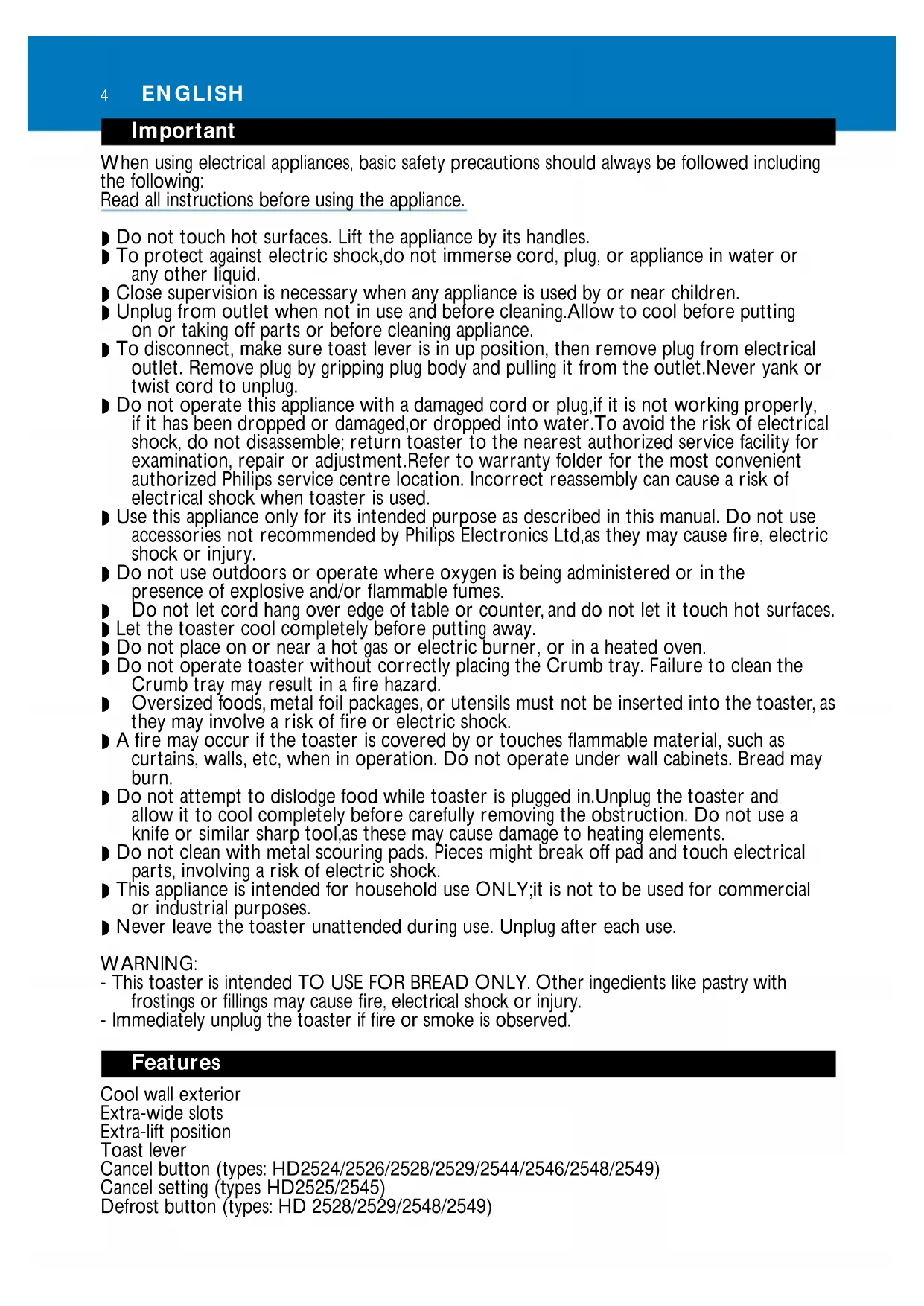 - This toaster is intended TO USE FOR BREAD ONLY. Other ingedients like pastry with frostings or fillings may cause fire, electrical shock or injury. - Immediately unplug the toaster if fire or smoke is observed. Features Cool wall exterior Extra-wide slots Extra-lift position Toast lever Cancel button (types: HD2524/2526/2528/2529/2544/2546/2548/2549) Cancel setting (types HD2525/2545) Defrost button (types: HD 2528/2529/2548/2549) ENGLISH 4Defrost setting (types HD2524/2525/2544/2545) Bagel button (types HD2525/2528/2529/2545/2548/2549) Reheat setting Browning control Removable crumb tray Bunwarmer (HD 2526/2529/2546/2549) Cord storage Auto shut-off Toasting bread