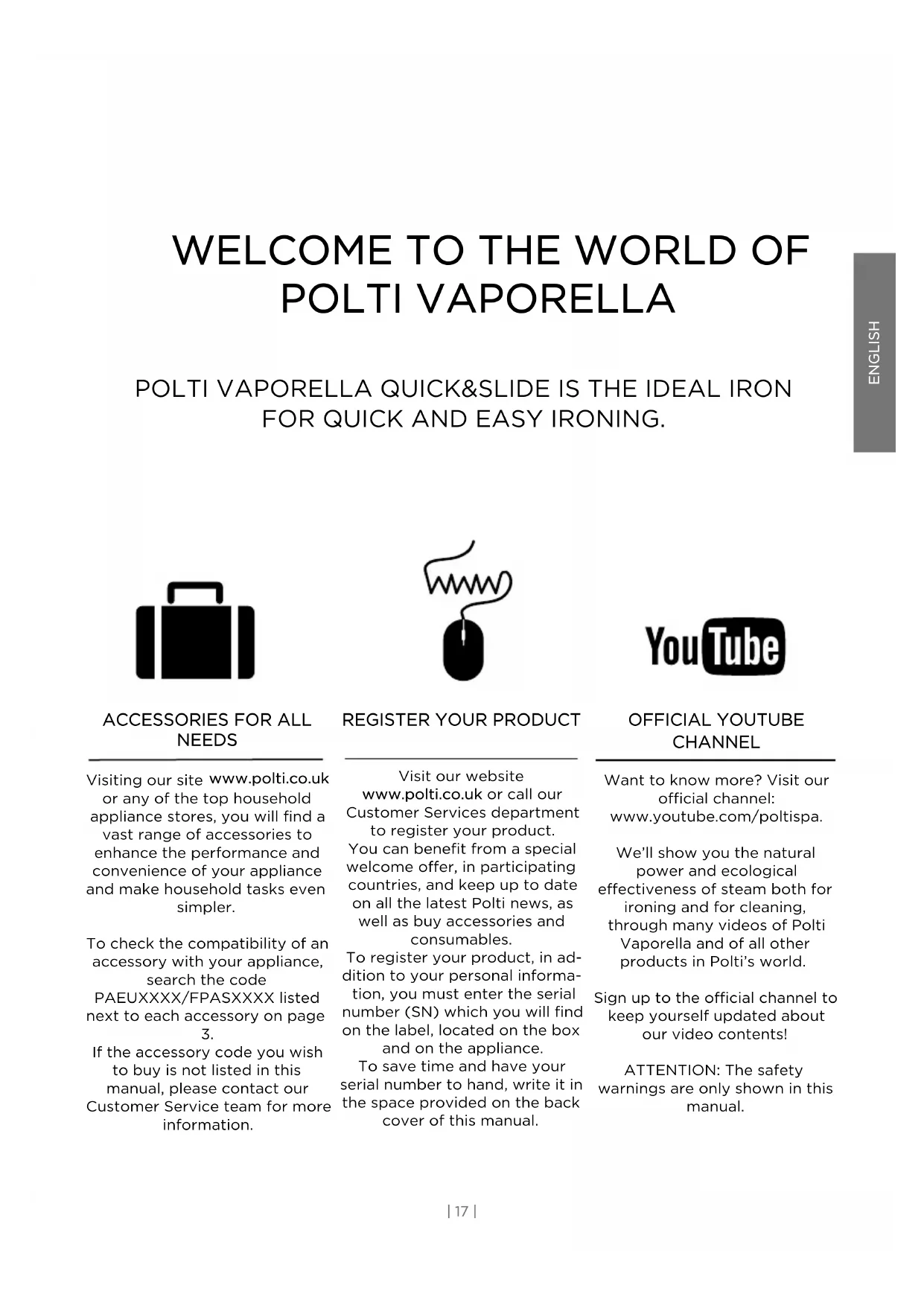 Visit our website www.polti.co.uk or call our Customer Services department to register your product. You can benefit from a special welcome offer, in participating countries, and keep up to date on all the latest Polti news, as well as buy accessories and consumables. To register your product, in ad- dition to your personal informa- tion, you must enter the serial number (SN) which you will find on the label, located on the box and on the appliance. To save time and have your serial number to hand, write it in the space provided on the back cover of this manual. OFFICIAL YOUTUBE CHANNEL Want to know more? Visit our official channel: www.youtube.com/poltispa. We’ll show you the natural power and ecological effectiveness of steam both for ironing and for cleaning, through many videos of Polti Vaporella and of all other products in Polti’s world. Sign up to the official channel to keep yourself updated about our video contents! ATTENTION: The safety warnings are only shown in this manual.SAFETY WARNINGS