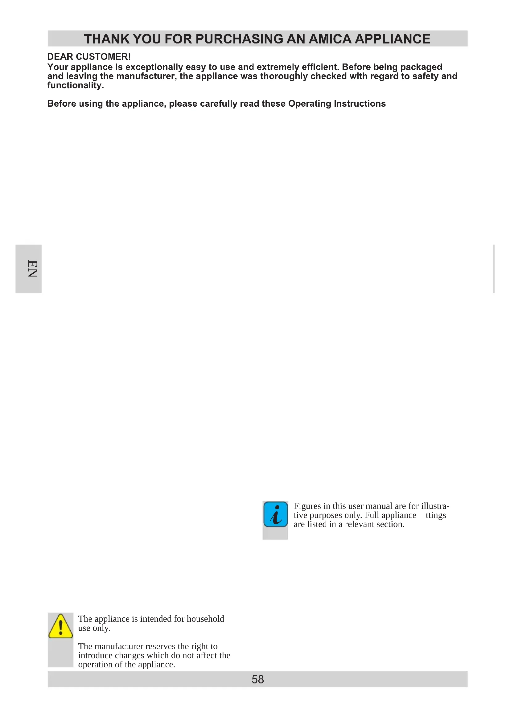 Figures in this user manual are for illustra- tive purposes only. Full appliance ttings are listed in a relevant section. EN59