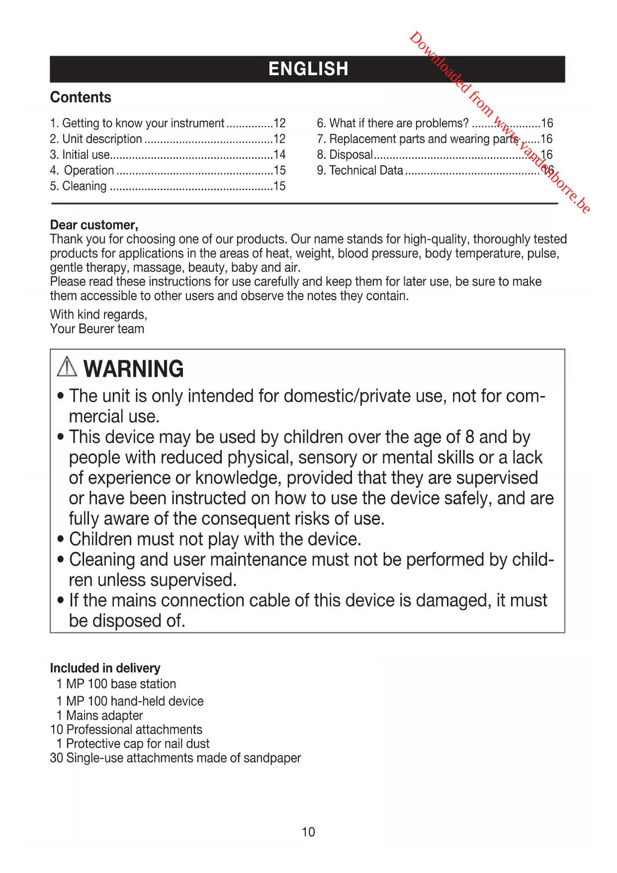 - If the mains connection cable of this device is damaged, it must be disposed of. Included in delivery 1 MP 100 base station 1 MP 100 hand-held device 1 Mains adapter10 Professional attachments 1 Protective cap for nail dust30 Single-use attachments made of sandpaper ENGLISH Contents 1. Getting to know your instrument ...............122. Unit description .........................................123. Initial use....................................................144. Operation ..................................................155. Cleaning ....................................................156. What if there are problems? ......................167. Replacement parts and wearing parts ......168. Disposal .....................................................16