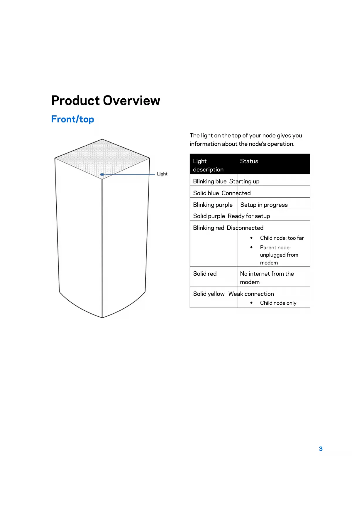 With your node connected to power and turned on, press and hold the Reset button on the bottom. The light on top of the node will turn red and fade in pulses. Do not release the button until the light goes out and then turns bright red.33 Specifications Linksys Velop Model Name
