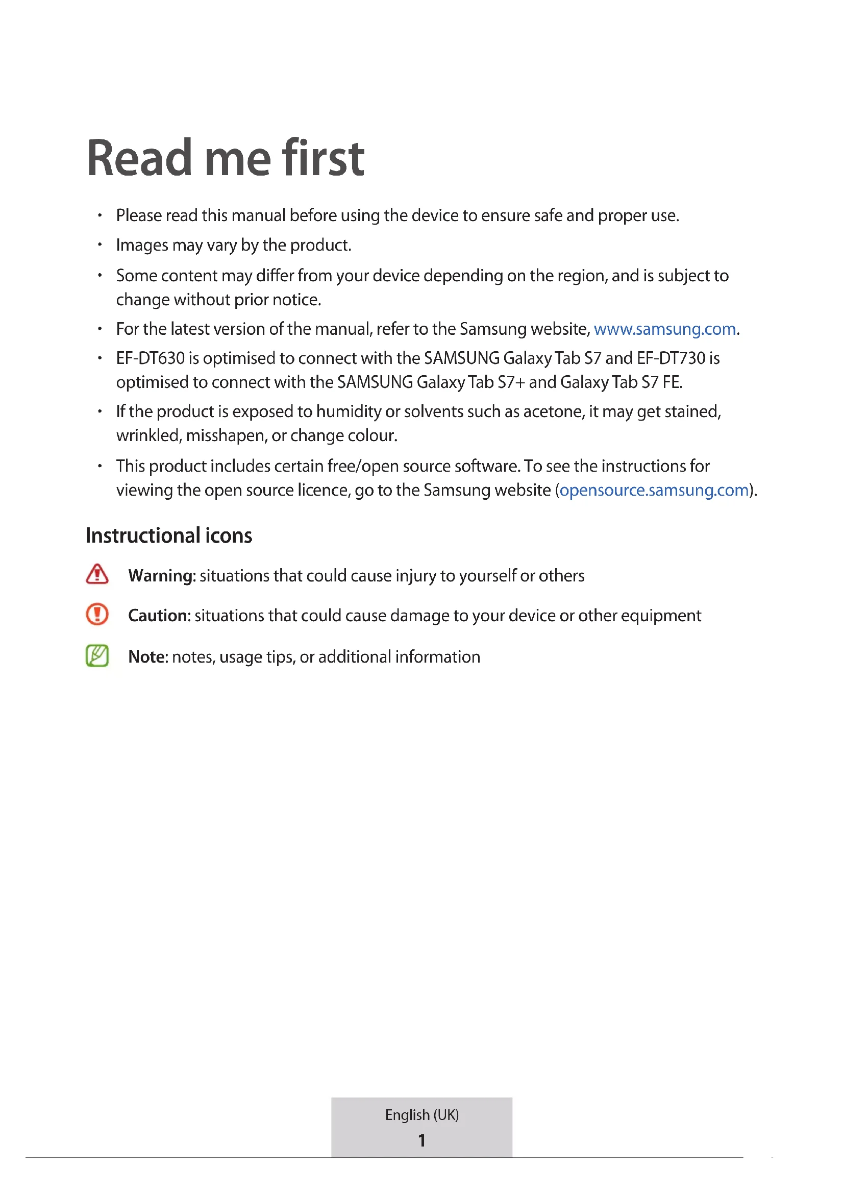 This product includes certain free/open source software. To see the instructions for viewing the open source licence, go to the Samsung website (opensource.samsung.com). Instructional icons