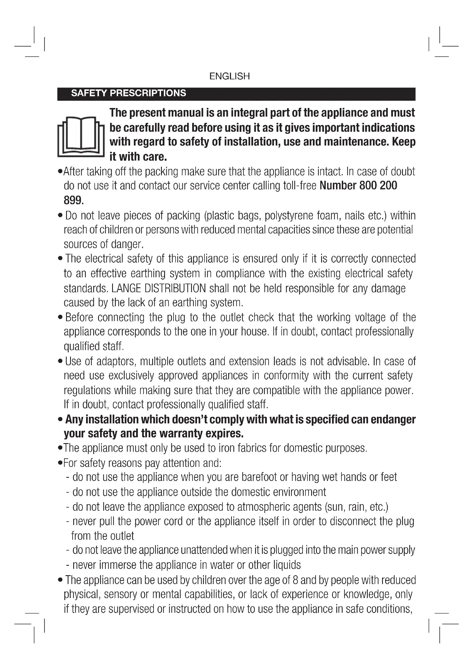 - The electrical safety of this appliance is ensured only if it is correctly connected to an effective earthing system in compliance with the existing electrical safety standards. LANGE DISTRIBUTION shall not be held responsible for any damage caused by the lack of an earthing system.