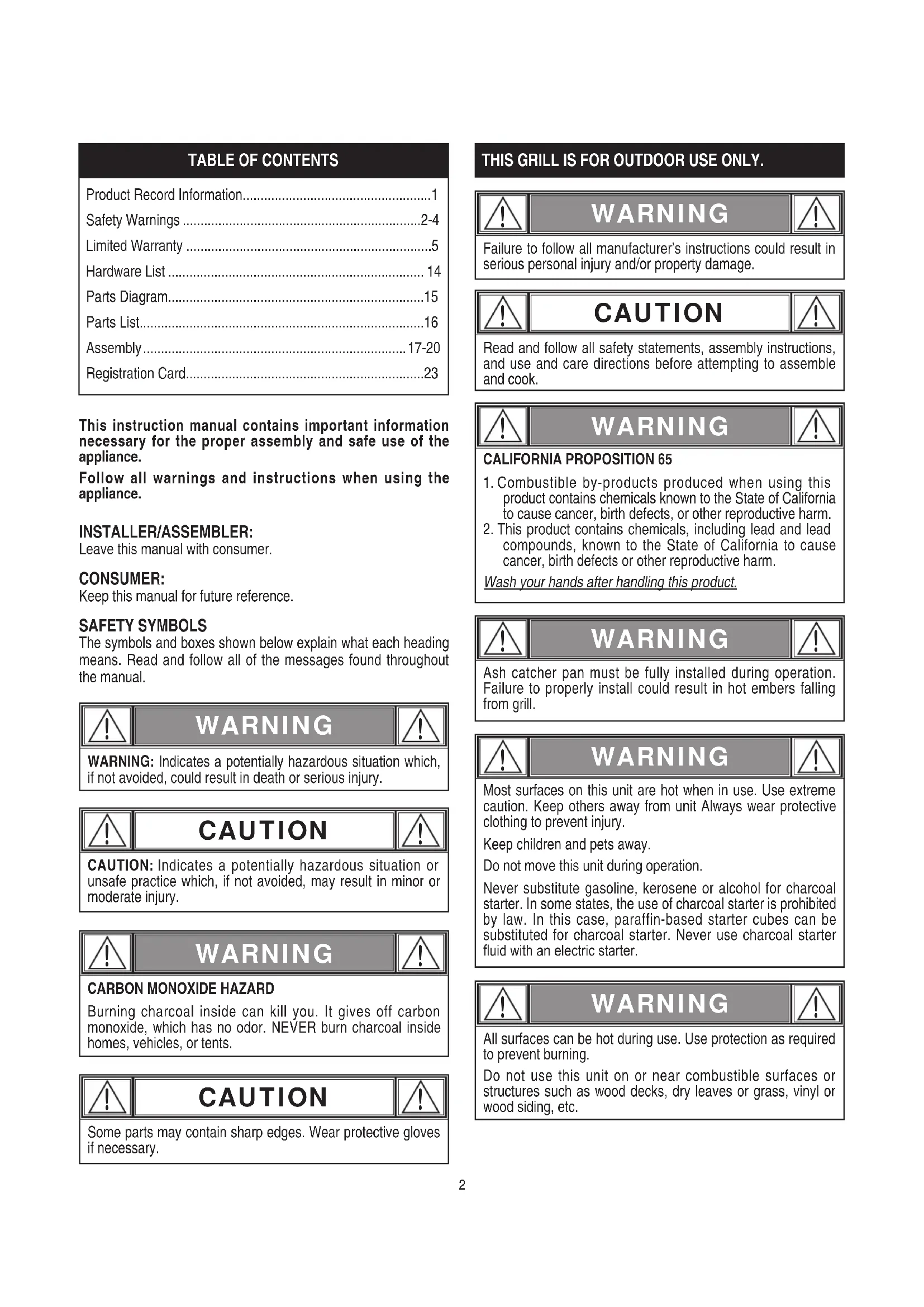 WARNING CAUTION CAUTION Failure to follow all manufacturer’s instructions could result in serious personal injury and/or property damage. Read and follow all safety statements, assembly instructions, and use and care directions before attempting to assemble and cook. Some parts may contain sharp edges. Wear protective gloves if necessary. THIS GRILL IS FOR OUTDOOR USE ONLY.