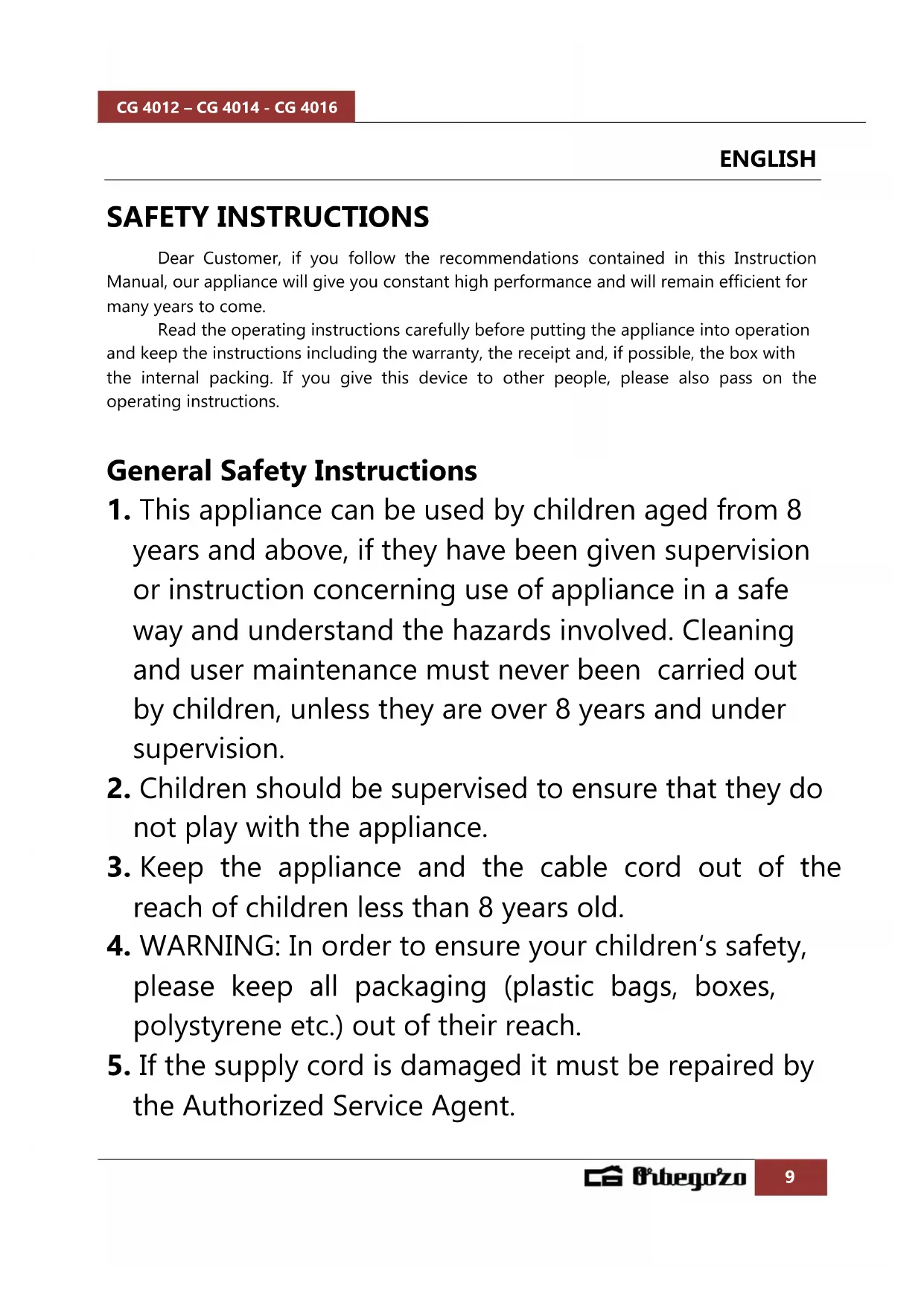 The European directive 2012/19/EU on Waste Electrical and Electronic Equipment (WEEE), requires that old household electrical appliances must not be disposed of in the normal unsorted municipal waste stream. Old appliances must be collected separately in order to optimize the recovery and recycling of the materials they contain, and reduce the impact on human health and the environment. The crossed out “wheeled bin” symbol on the product reminds you of your obligation, that when you dispose of the appliance, it must be separately collected. Consumers should contact their local authority or retailer for information concerning the correct disposal of their old appliance. DECLARATION OF CONFORMITY: This device complies with the requirements of the Low Voltage Directive 2014/35/EU and the requirements of the EMC directive 2014/30/EU. GUARANTEE This appliance is covered and is entitled to the legal guarantee in accordance with the legislation in force from the date of purchase. Keep the purchase receipt to be able to claim your right to the guarantee. To find the closest service to your location, contact through the following web link: https://orbegozo.com/asistencia- tecnica/ For any type of query, doubt or incident, you can contact us through our email shown on the main page of this manual or through our technical assistance service at https://orbegozo.com/contacto/ Orbegozo is not responsible for components and accessories that are subject to wear and tear due to use, as well as perishable compounds or those that have deteriorated due to improper use. Nor will it be held responsible if the owner has technically modified the device. Check the legal conditions on our website.CG 4012 – CG 4014 - CG 4016
