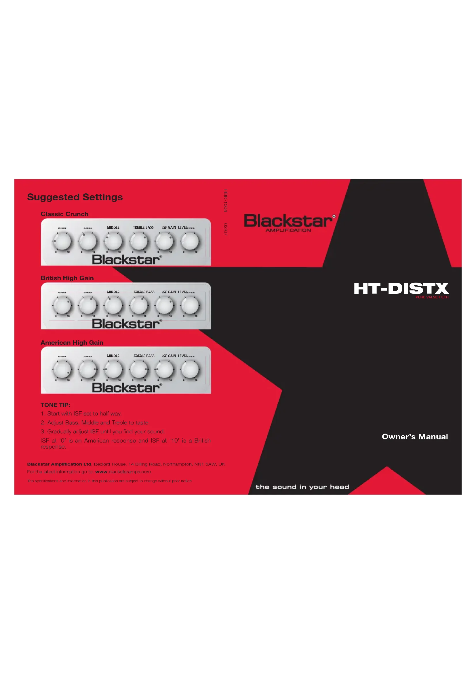 Owner’s Manual HBK-1004 02/07 Blackstar Amplification Ltd, Beckett House, 14 Billing Road, Northampton, NN1 5AW, UKFor the latest information go to: www.blackstaramps.comThe specifications and information in this publication are subject to change without prior notice.