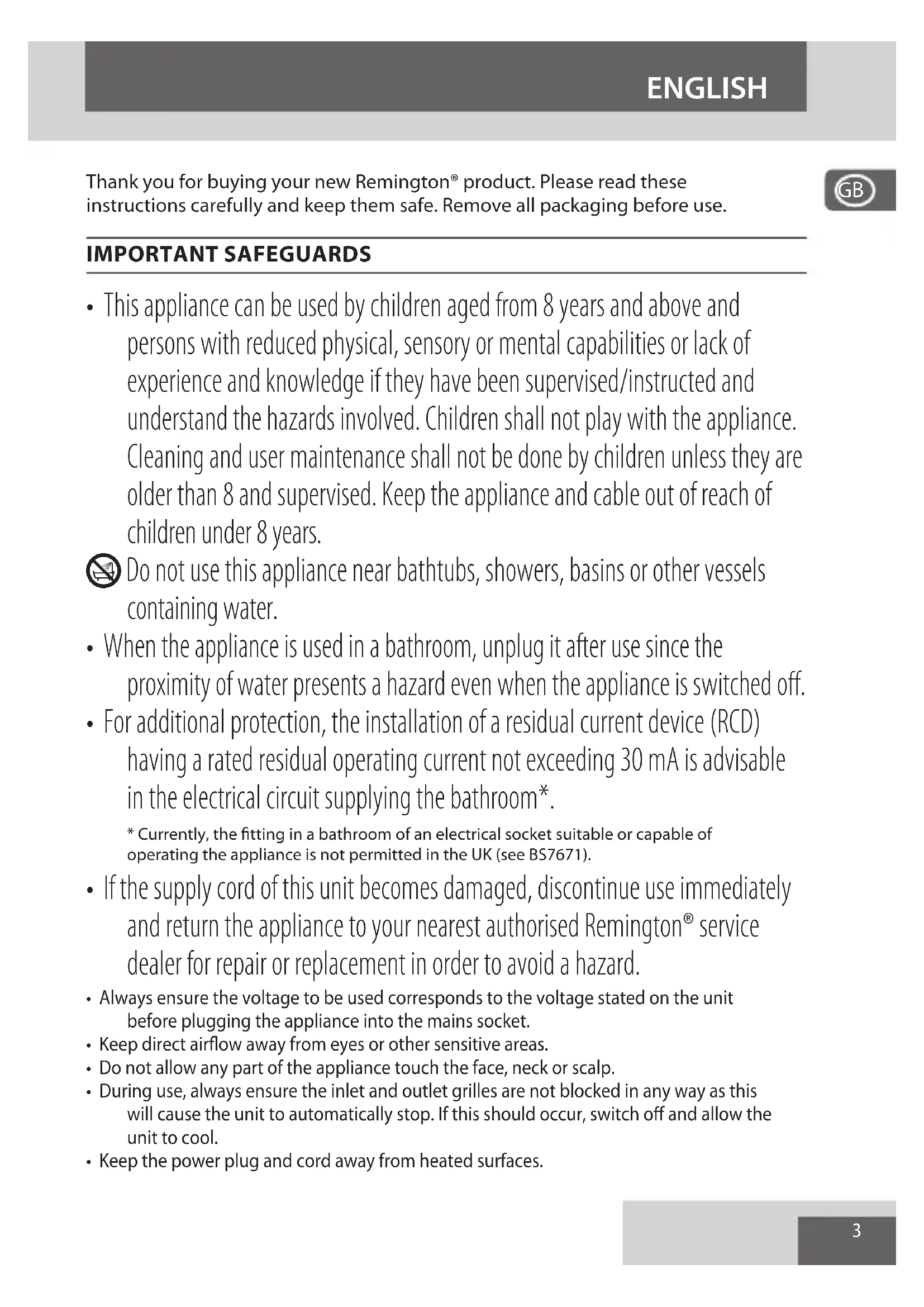 Thank you for buying your new Remington® product. Please read these instructions carefully and keep them safe. Remove all packaging before use. IMPORTANT SAFEGUARDS