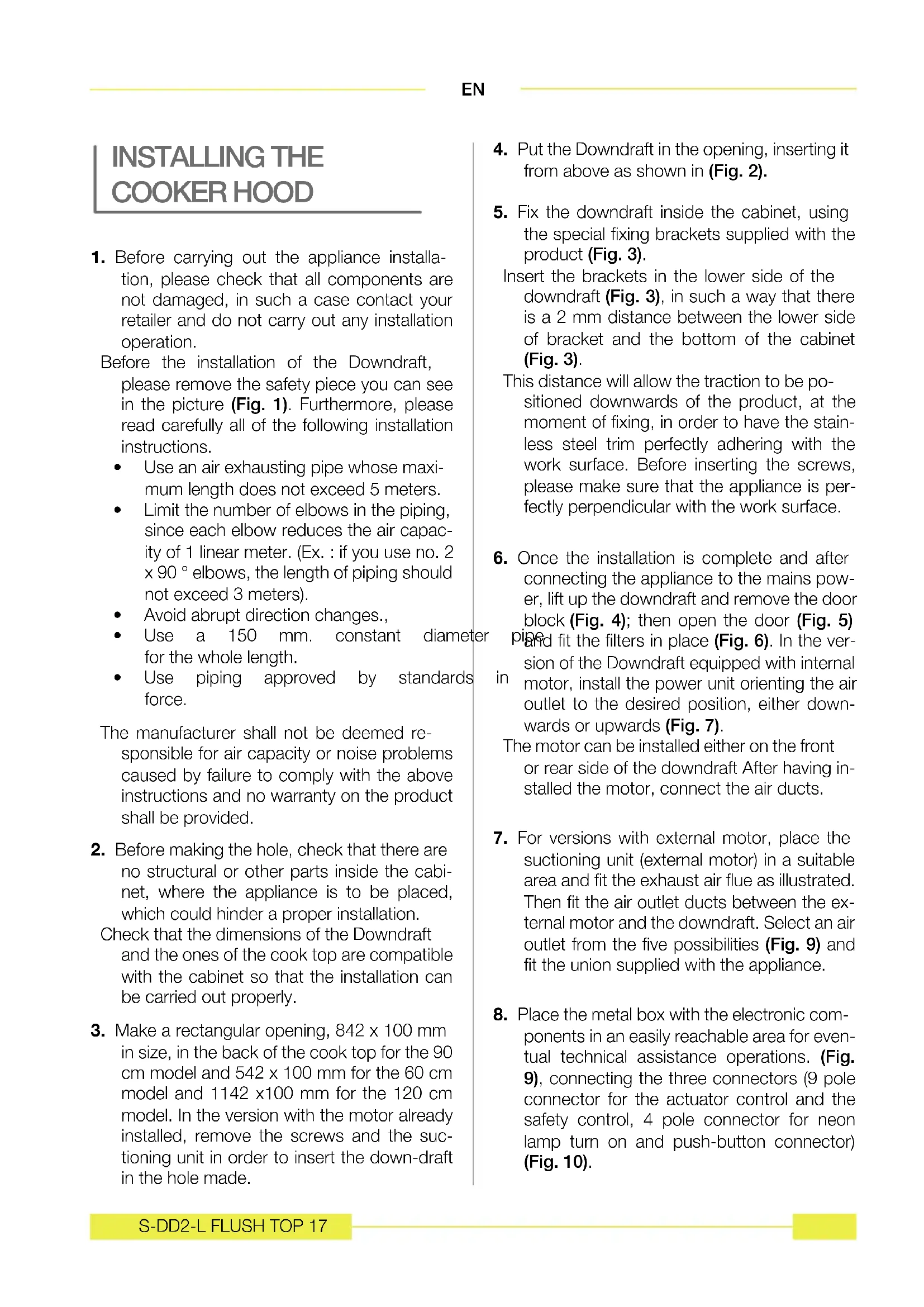 - Whenhandlingthedowndraft,neverputyour hands in the field of action of the extractable unit. Constantly seeking to improve our products, we reserve the right to modify their technical, func- tional, or aesthetic characteristics deriving from their upgrading. In the case of the version with external motor, fornormal downdraft operation, it is necessary to use a suctioning unit (external motor) made by the same manufacturer. The air collected must not be conveyed into a flue used for smoke or fumes from appliances powered by anything other than electricity (cen- tral heating systems, etc.). As far as discharg- ing exhaust air is concerned, please follow the guide- lines given by competent authorities. WARNING Keep these instructions for use with the ap- pliance. If the appliance should be sold or passed on to others, make sure that the in- structions are passed on with it. We thank you for taking note of these suggestions be- fore installing and using the appliance. They have been written for your personal safety and the safety of others.S-DD2-L FLUSH TOP 15