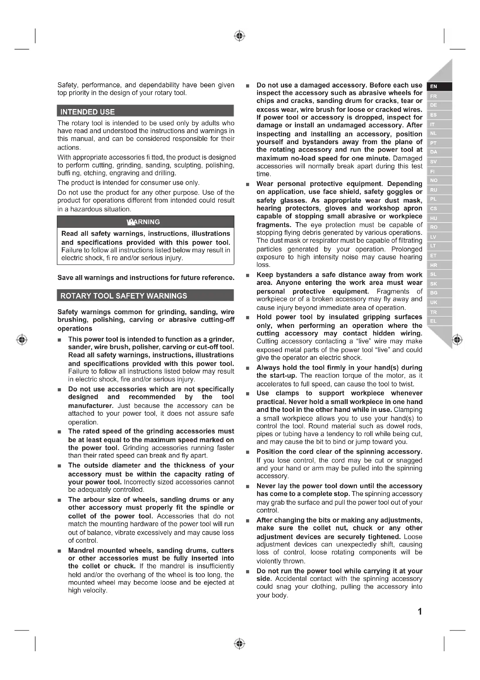 Safety, performance, and dependability have been given top priority in the design of your rotary tool. INTENDED USE The rotary tool is intended to be used only by adults who have read and understood the instructions and warnings in this manual, and can be considered responsible for their actions. With appropriate accessories fi tted, the product is designed to perform cutting, grinding, sanding, sculpting, polishing, buffi ng, etching, engraving and drilling. The product is intended for consumer use only. Do not use the product for any other purpose. Use of the product for operations different from intended could result in a hazardous situation. WARNING Read all safety warnings, instructions, illustrations and specifications provided with this power tool. Failure to follow all instructions listed below may result in electric shock, fi re and/or serious injury. Save all warnings and instructions for future reference.