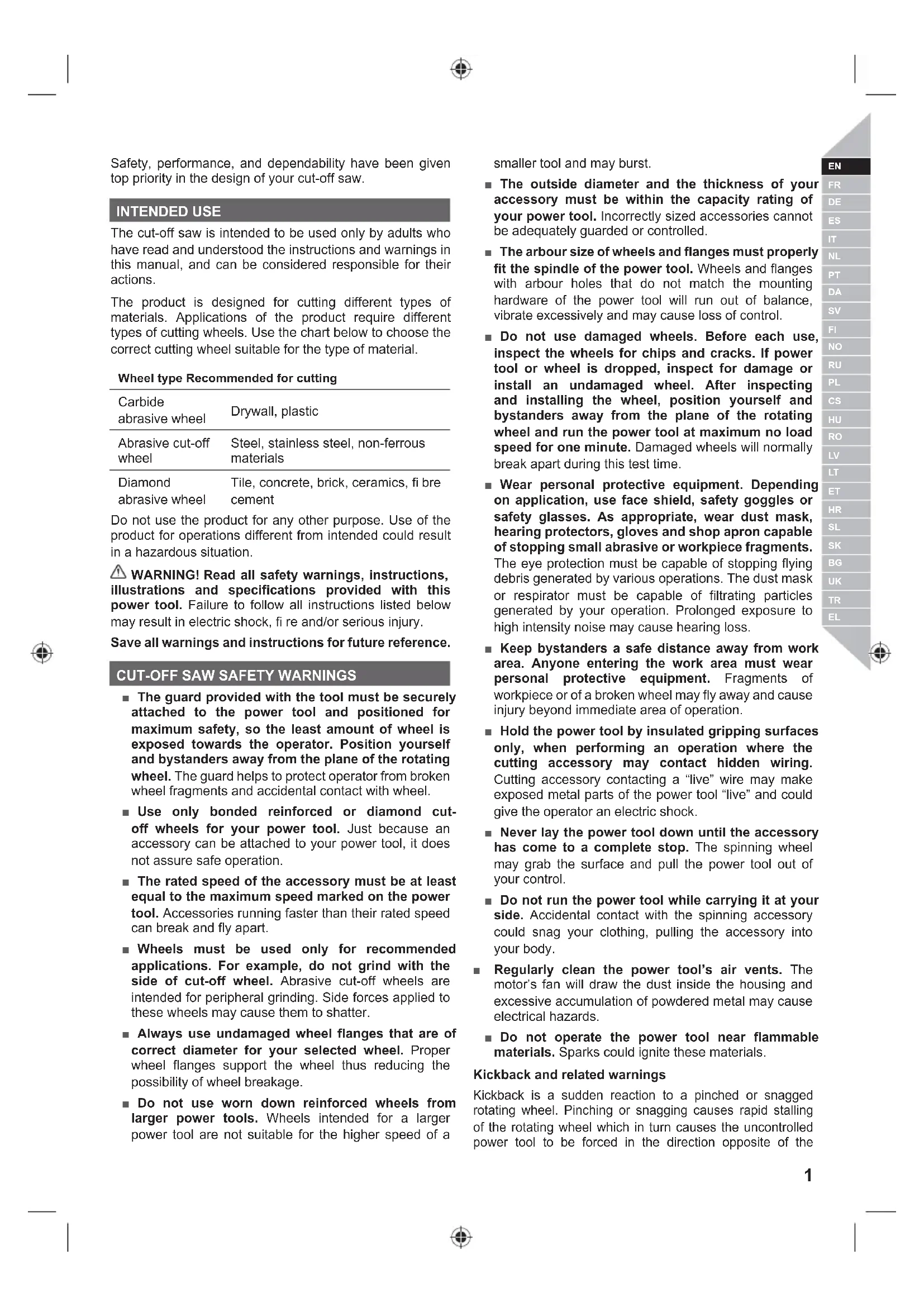 Safety, performance, and dependability have been given top priority in the design of your cut-off saw. INTENDED USE The cut-off saw is intended to be used only by adults who have read and understood the instructions and warnings in this manual, and can be considered responsible for their actions. The product is designed for cutting different types of materials. Applications of the product require different types of cutting wheels. Use the chart below to choose the correct cutting wheel suitable for the type of material. Wheel type Recommended for cutting Carbide abrasive wheel Drywall, plastic Abrasive cut-off wheel Steel, stainless steel, non-ferrous materials Diamond abrasive wheel Tile, concrete, brick, ceramics, fi bre cement Do not use the product for any other purpose. Use of the product for operations different from intended could result in a hazardous situation. WARNING! Read all safety warnings, instructions, illustrations and specifications provided with this power tool. Failure to follow all instructions listed below may result in electric shock, fi re and/or serious injury. Save all warnings and instructions for future reference.