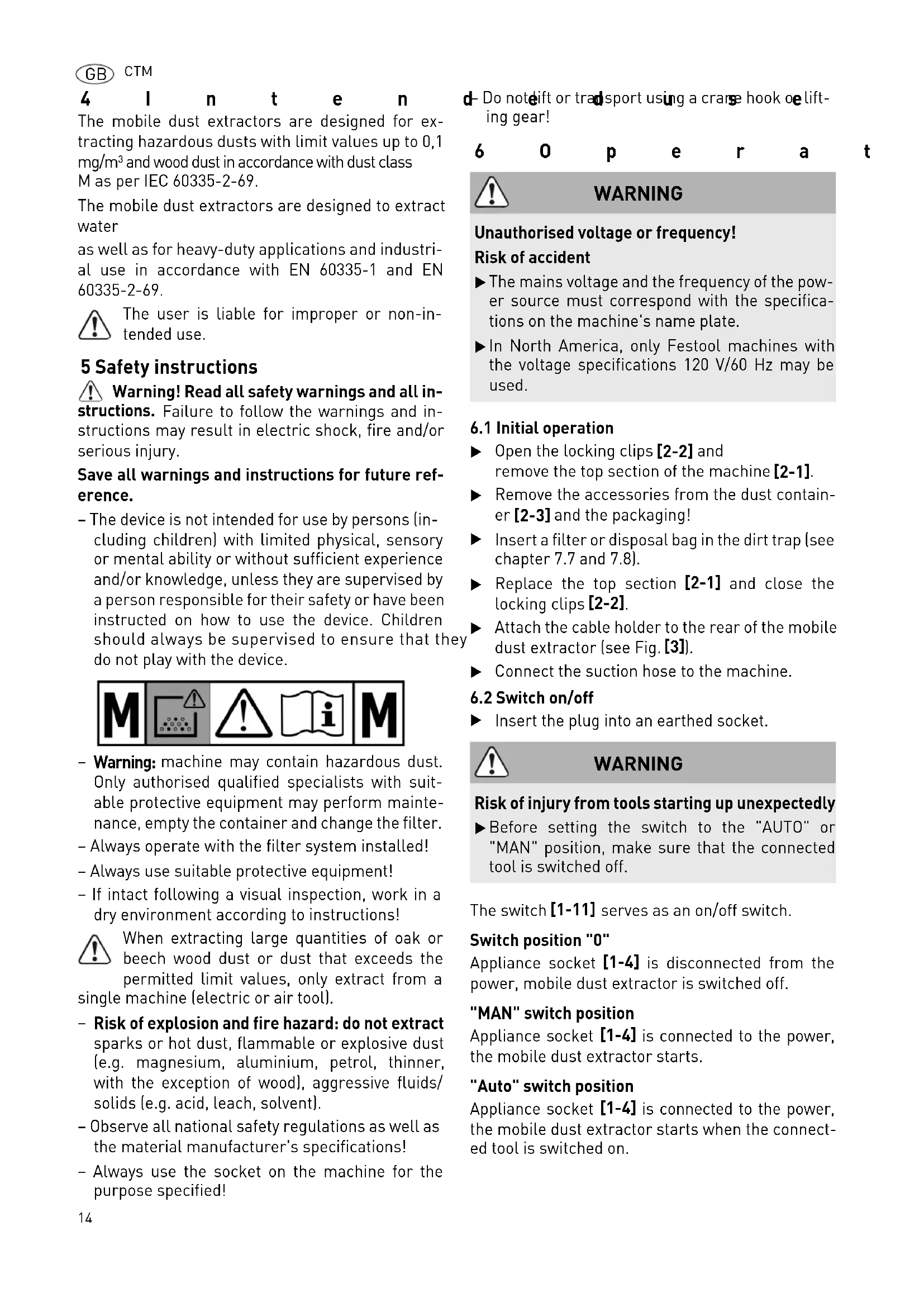 Insert the plug into an earthed socket. The switch [1-11] serves as an on/off switch. Switch position "0" Appliance socket [1-4] is disconnected from the power, mobile dust extractor is switched off. "MAN" switch position Appliance socket [1-4] is connected to the power, the mobile dust extractor starts. "Auto" switch position Appliance socket [1-4] is connected to the power, the mobile dust extractor starts when the connect- ed tool is switched on. WARNING Unauthorised voltage or frequency! Risk of accident