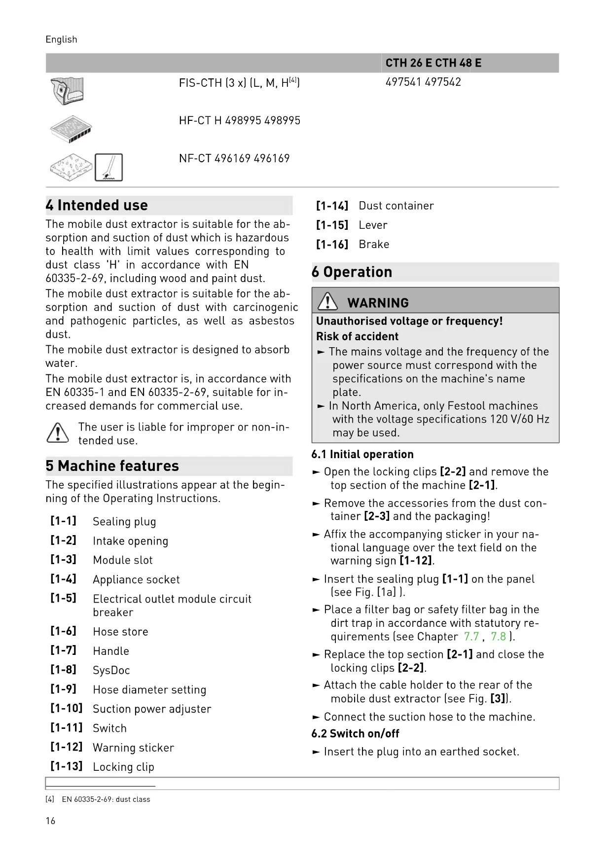 HF‑CT H 498995 498995 NF‑CT 496169 496169 4 Intended use The mobile dust extractor is suitable for the ab sorption and suction of dust which is hazardous to health with limit values corresponding to dust class 'H' in accordance with EN 60335-2-69, including wood and paint dust. The mobile dust extractor is suitable for the ab sorption and suction of dust with carcinogenic and pathogenic particles, as well as asbestos dust. The mobile dust extractor is designed to absorb water. The mobile dust extractor is, in accordance with EN 60335-1 and EN 60335-2-69, suitable for in creased demands for commercial use. The user is liable for improper or non-in tended use. 5 Machine features The specified illustrations appear at the begin- ning of the Operating Instructions. [1-1] Sealing plug [1-2] Intake opening [1-3] Module slot [1-4] Appliance socket [1-5] Electrical outlet module circuit breaker [1-6] Hose store [1-7] Handle [1-8] SysDoc [1-9] Hose diameter setting [1-10] Suction power adjuster [1-11] Switch [1-12] Warning sticker [1-13] Locking clip [1-14] Dust container [1-15] Lever [1-16] Brake 6 Operation WARNING Unauthorised voltage or frequency! Risk of accident ► The mains voltage and the frequency of the power source must correspond with the specifications on the machine's name plate. ► In North America, only Festool machines with the voltage specifications 120 V/60 Hz may be used.