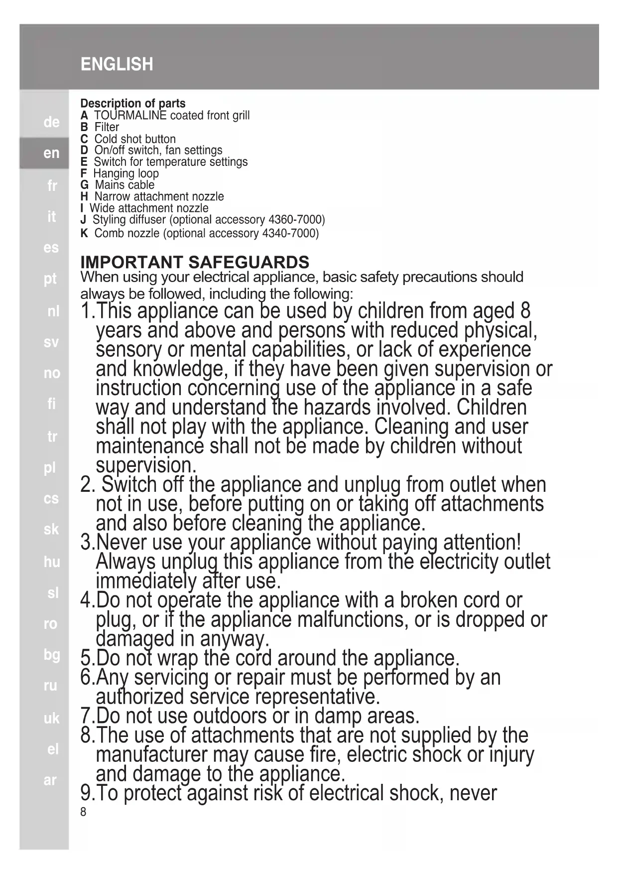 Description of parts A TOURMALINE coated front grill B Filter C Cold shot button D On/off switch, fan settings E Switch for temperature settings F Hanging loop G Mains cable H Narrow attachment nozzle I Wide attachment nozzle J Styling diffuser (optional accessory 4360-7000) K Comb nozzle (optional accessory 4340-7000) IMPORTANT SAFEGUARDS When using your electrical appliance, basic safety precautions should always be followed, including the following: 1.This appliance can be used by children from aged 8 years and above and persons with reduced physical, sensory or mental capabilities, or lack of experience and knowledge, if they have been given supervision or instruction concerning use of the appliance in a safe way and understand the hazards involved. Children shall not play with the appliance. Cleaning and user maintenance shall not be made by children without supervision.