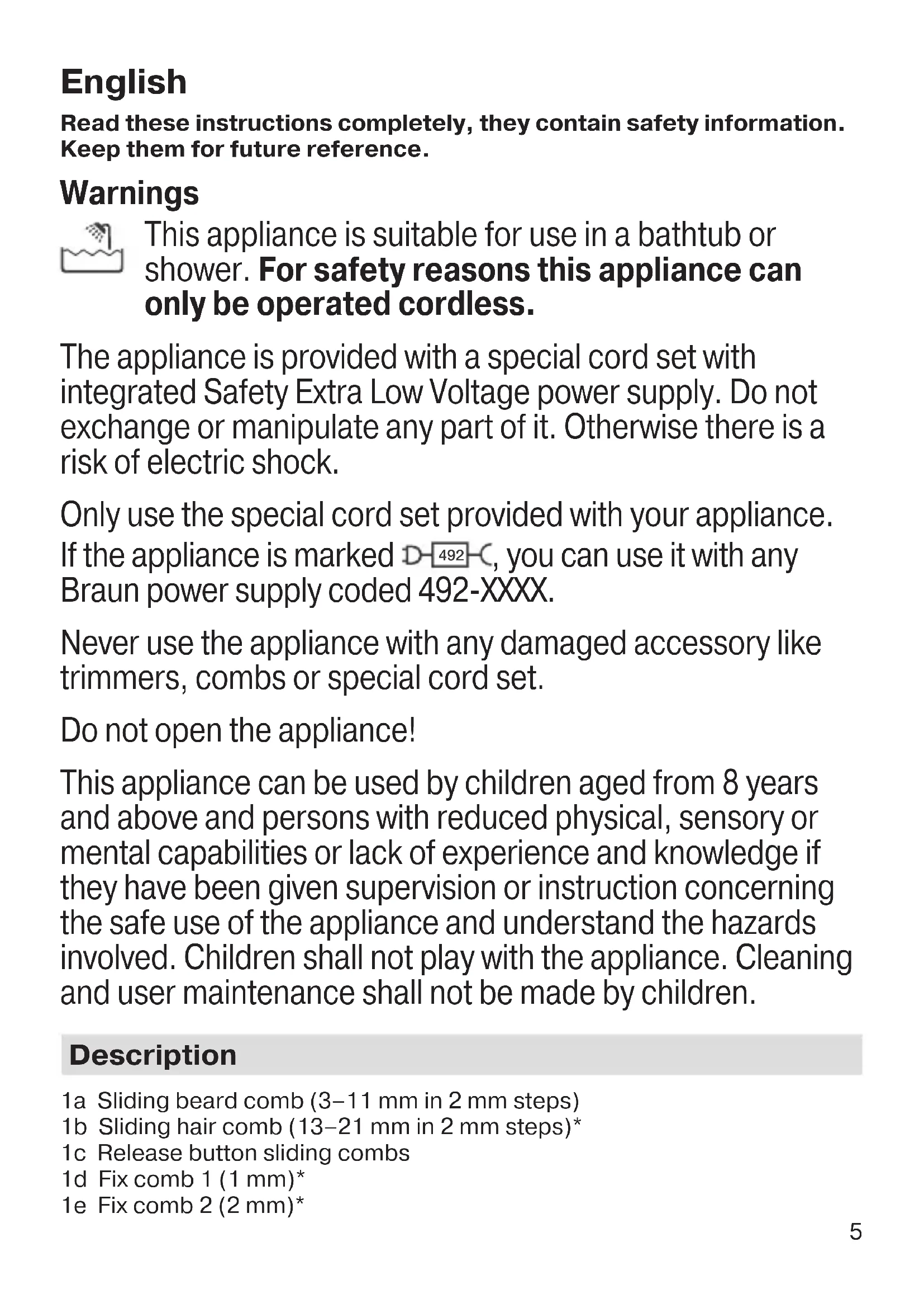 , you can use it with any Braun power supply coded 492-XXXX. Never use the appliance with any damaged accessory like trimmers, combs or special cord set. Do not open the appliance! This appliance can be used by children aged from 8 years and above and persons with reduced physical, sensory or mental capabilities or lack of experience and knowledge if they have been given supervision or instruction concerning the safe use of the appliance and understand the hazards involved. Children shall not play with the appliance. Cleaning and user maintenance shall not be made by children. Description 1a Sliding beard comb (3–11 mm in 2 mm steps) 1b Sliding hair comb (13–21 mm in 2 mm steps)* 1c Release button sliding combs 1d Fix comb 1 (1 mm)* 1e Fix comb 2 (2 mm)* 90618559_MGK7221_7220_7920_MGK5280_CEEMEA.indd 590618559_MGK7221_7220_7920_MGK5280_CEEMEA.indd 5 21.05.19 10:2921.05.19 10:29 Business Use - P&G AUTHORIZED POA-00133196 Rev 001 Effective Date 2019-05-24 Printed 2022-03-31 Page 5 of 806 2a Trimmer head 2b Ear & nose trimmer head* 2c Detailed trimmer head* 2d Body groomer head* 2e Mini foil shaver head* 3 On/off button 4 Charging indicator 5 Power socket 6 Special cord set (design can differ) 7 Charging stand*