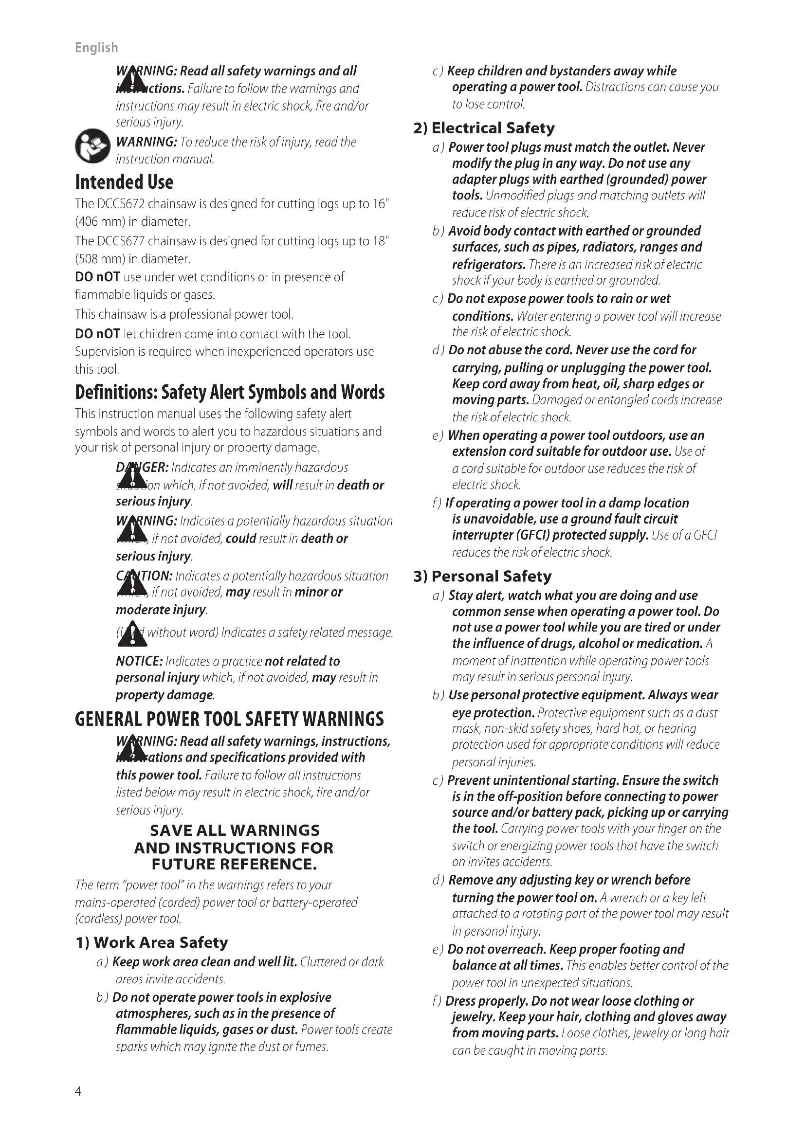 (Used without word) Indicates a safety relatedmessage. NOTICE: Indicates a practice not related to personal injury which, if not avoided, may result in propertydamage. Intended Use The DCCS672 chainsaw is designed for cutting logs up to 16" (406 mm) indiameter. The DCCS677 chainsaw is designed for cutting logs up to 18" (508 mm) indiameter. DO nOT use under wet conditions or in presence of flammable liquids orgases. This chainsaw is a professional powertool. DO nOT let children come into contact with the tool. Supervision is required when inexperienced operators use thistool. English (original instructions)
