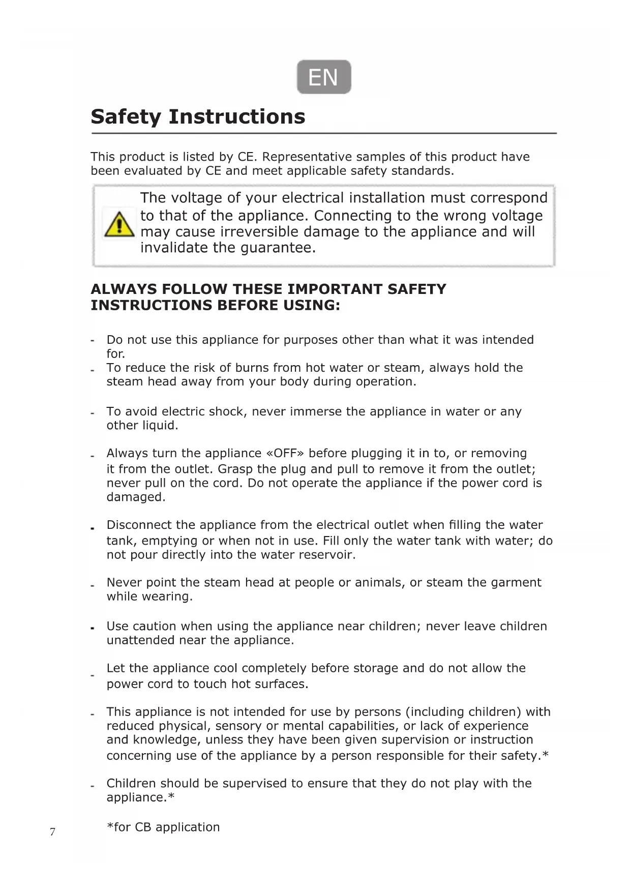 INSTRUCTIONS BEFORE USING: This product is listed by CE. Representative samples of this product have been evaluated by CE and meet applicable safety standards. Do not use this appliance for purposes other than what it was intended for. To reduce the risk of burns from hot water or steam, always hold the steam head away from your body during operation. To avoid electric shock, never immerse the appliance in water or any other liquid. Always turn the appliance «OFF» before plugging it in to, or removing it from the outlet. Grasp the plug and pull to remove it from the outlet; never pull on the cord. Do not operate the appliance if the power cord is damaged. Disconnect the appliance from the electrical outlet when lling the water tank, emptying or when not in use. Fill only the water tank with water; do not pour directly into the water reservoir. Never point the steam head at people or animals, or steam the garment while wearing. Use caution when using the appliance near children; never leave children unattended near the appliance. Let the appliance cool completely before storage and do not allow the power cord to touch hot surfaces. This appliance is not intended for use by persons (including children) with reduced physical, sensory or mental capabilities, or lack of experience and knowledge, unless they have been given supervision or instruction concerning use of the appliance by a person responsible for their safety.* Children should be supervised to ensure that they do not play with the appliance.* *for CB application The voltage of your electrical installation must correspond to that of the appliance. Connecting to the wrong voltage may cause irreversible damage to the appliance and will invalidate the guarantee. EN8 This appliance can be used by children aged from 14 years old and above and persons with reduced physical, sensory or mental capabilities or lack of experi- ence and knowledge if they have been given supervision or instruction concern- ing use of the appliance in a safe way and understand the hazards involved. Children shall not be play with the appliance. Cleaning and user maintenance shall not be made by children without supervision. For optimal use of the appliance, see “Maintenance” and “lling” on the quick start. If the supply cord is damaged, it must be replaced by the manufacturer, its service agent or similarly qualied persons in order to avoid a hazard. Care should be taken when using the appliance due to the emission of steam. Disconnect the appliance from the electrical outlet when lling the water tank, cleaning, emptying or when not in use. EN9 Do not operate the appliance if it has been dropped or damaged. To avoid the risk of injury, re or electric shock, do not attempt to disas- semble or repair the appliance; take it to a qualied service center for repair. Use caution when emptying the water tank after use; water in the tank may be hot. Do not touch metal parts until the unit has cooled to avoid the risk of burns; use caution when changing attachments, they may be hot or contain hot water. Always keep the hose and nozzle elevated above the water tank. Steam in an up and down vertical motion. Using the steamer in a horizon- tal position or tilting it back may result in hot water discharge. Always hang the steam head on the head support/hook. Never place the steam head on the oor, furniture or lay it on the power cord while it is hot or plugged in as this may result in re or electric shock. Never drop or insert objects into the hose or any of the openings. The use of accessories and attachments other than those provided by SteamOne is not recommended and may result in re, electric shock or personal injury. This unit is for indoor use only. Do not cut or attempt to extend the steaming hose. To prevent overheating of the appliance, please be sure that the tele- scopic rod is extended to its highest position before hanging clothes on the garment hook for steaming. Do not allow the steamer to run dry. To avoid a circuit overload, do not operate another high wattage appliance on the same circuit. If necessary, use an extension cord specically designed for appliances, lesser cords may overheat. SPECIAL INSTRUCTIONS: To avoid a circuit overload, do not operate another high wattage appliance on the same circuit. If necessary, use an extension cord specically designed for appliances, lesser cords may overheat. EN10 Warranty SteamOne warranty This product is covered during the warranty period by SteamOne (contact details page 11) against any manufacturing defect. The warranty is valid for 2 years from the date of purchase and in the country specied. This SteamOne warranty is in addition to your consumer rights. All repair costs for a product recognized as having a defect are covered by the SteamOne warranty, in order to return it to a state of compliance with its original specications, either through repair, or possible replacement, of the defective parts. SteamOne may decide to oer a replacement product instead of repairing the defective one, depending on the situation. SteamOne’s obligations dened under the terms of this warranty are limited exclusively to repair or replacement, as stipulated above. Warranty terms and exclusions - The warranty period is that of the country of use of the product, even if the warranty period in the country of purchase is dierent. - The SteamOne warranty is only valid if local standards (voltage, electrical frequency, type of electric socket and all other local specications) are com- patible with the product. - The application of the SteamOne warranty may take longer if the model in question is not marketed in the country of use. - If the product covered by the warranty cannot be repaired in the country of use, the product may be replaced by an equivalent product or by another product of the same value wherever possible. - The SteamOne warranty is only valid upon presentation of proof of purchase and the warranty card (page 
