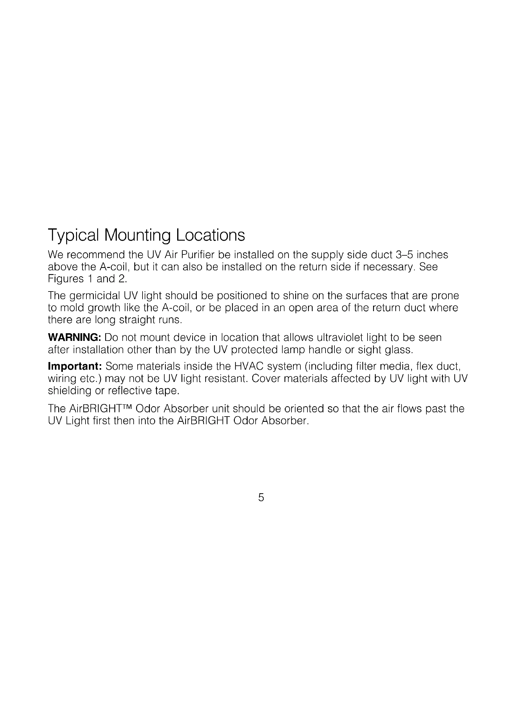 Typical Mounting Locations We recommend the UV Air Purifier be installed on the supply side duct 3–5 inches above the A-coil, but it can also be installed on the return side if necessary. See Figures 1 and 2. The germicidal UV light should be positioned to shine on the surfaces that are prone to mold growth like the A-coil, or be placed in an open area of the return duct where there are long straight runs.