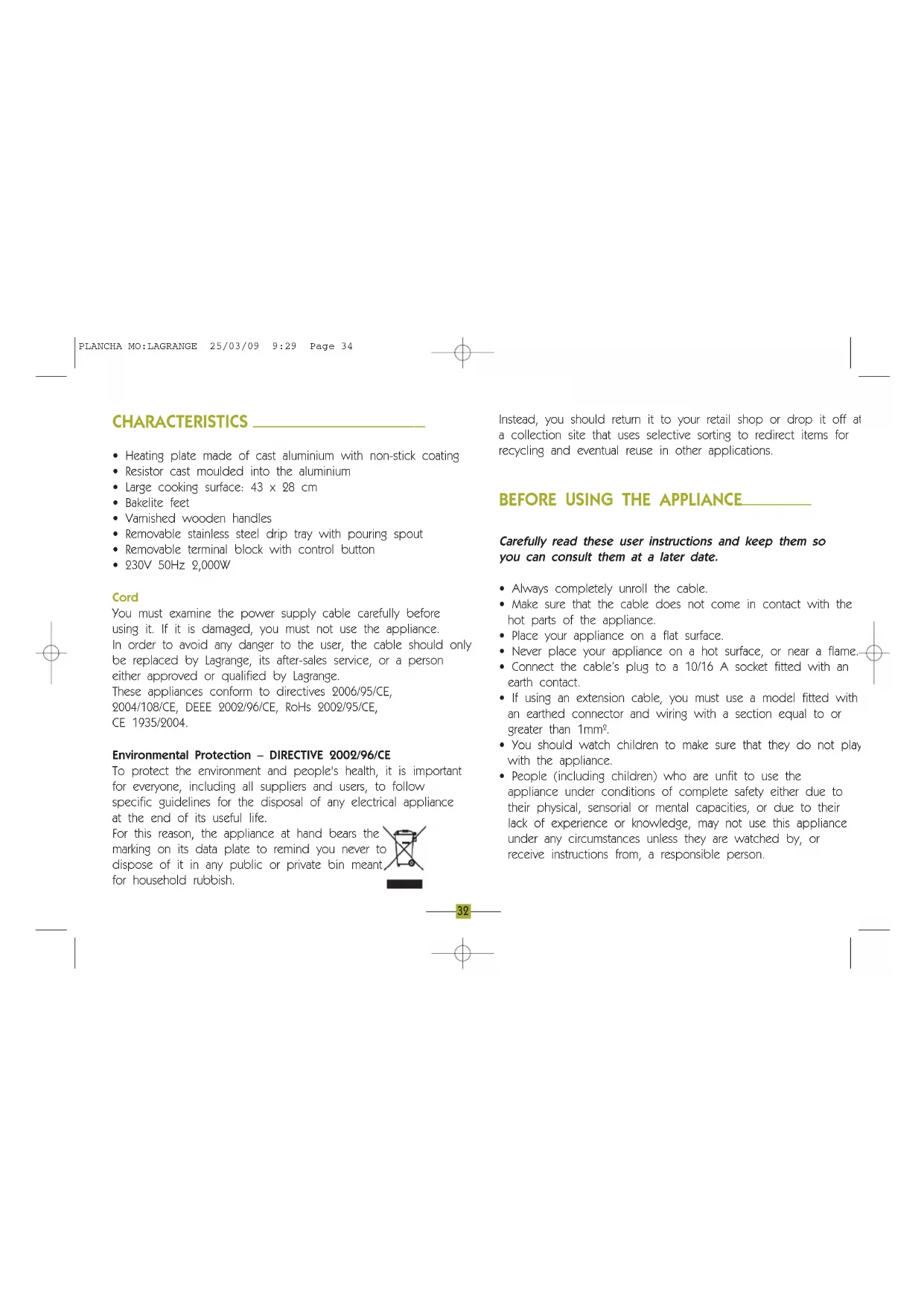 - People (including children) who are unfit to use the appliance under conditions of complete safety either due to their physical, sensorial or mental capacities, or due to their lack of experience or knowledge, may not use this appliance under any circumstances unless they are watched by, or receive instructions from, a responsible person. PLANCHA MO:LAGRANGE 25/03/09 9:29 Page 3433