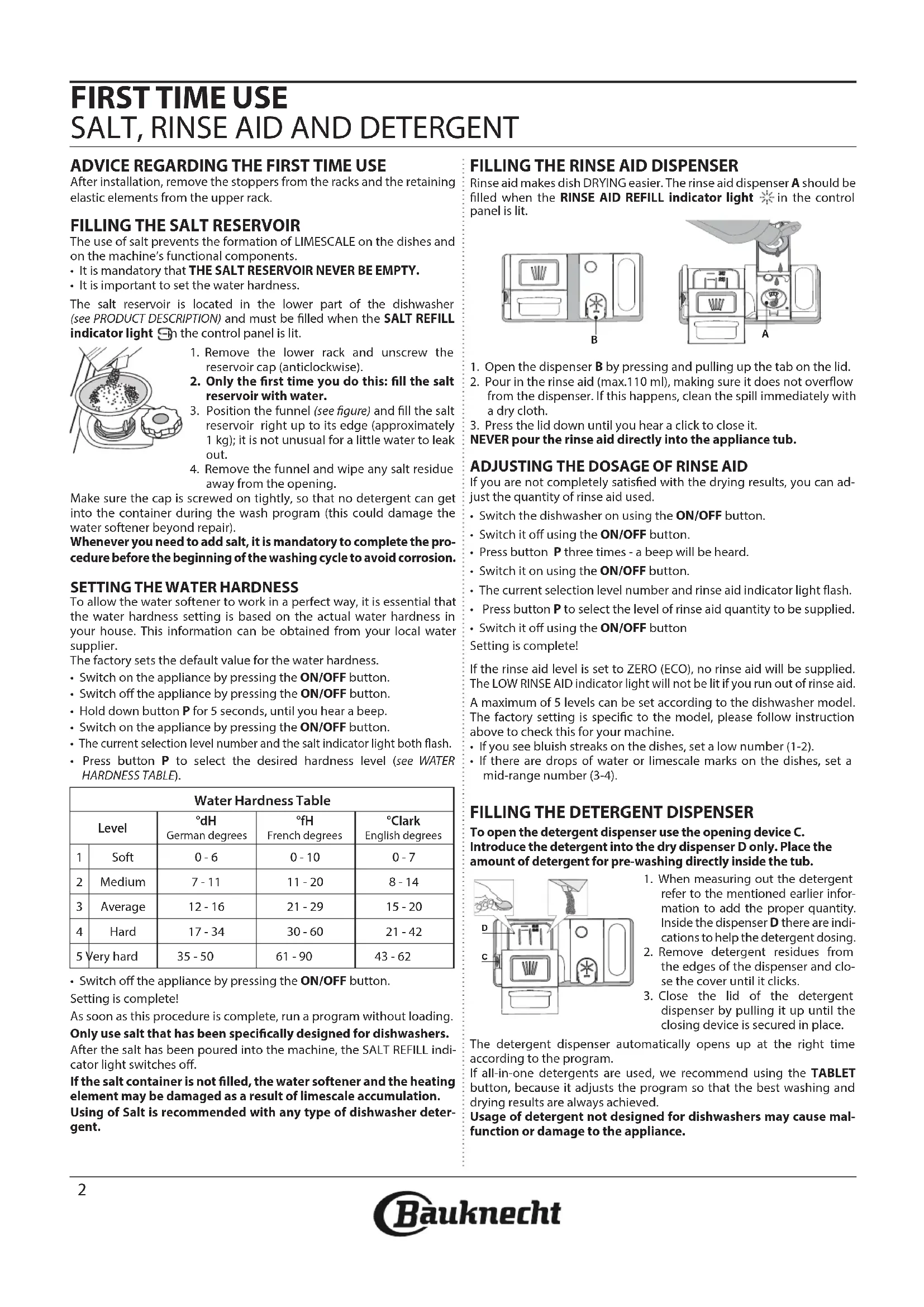 - Press button P to select the desired hardness level (see WATER HARDNESS TABLE).• Switch o the appliance by pressing the ON/OFF button.Setting is complete!As soon as this procedure is complete, run a program without loading.Only use salt that has been specically designed for dishwashers.After the salt has been poured into the machine, the SALT REFILL indi-cator light switches o.If the salt container is not lled, the water softener and the heating element may be damaged as a result of limescale accumulation.Using of Salt is recommended with any type of dishwasher deter-gent. Water Hardness Table Level °dH German degrees °fH French degrees°Clark English degrees 1 Soft 0 - 6 0 - 10 0 - 7 2 Medium 7 - 11 11 - 20 8 - 14 3 Average 12 - 16 21 - 29 15 - 20 4 Hard 17 - 34 30 - 60 21 - 42 5 Very hard 35 - 50 61 - 90 43 - 62