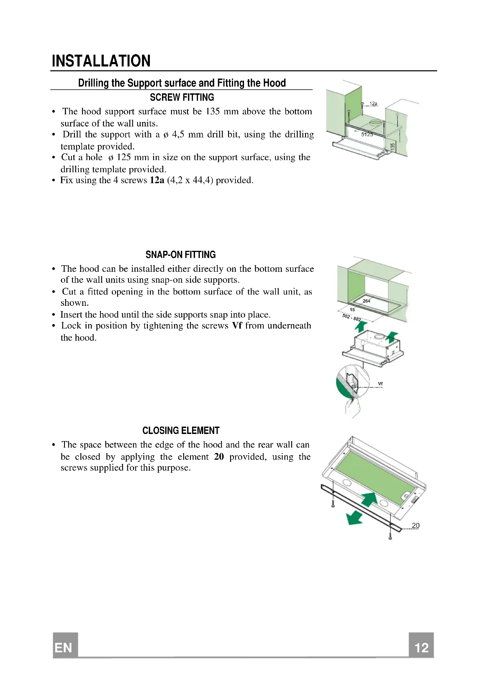 INSTALLATION Drilling the Support surface and Fitting the Hood SCREW FITTING