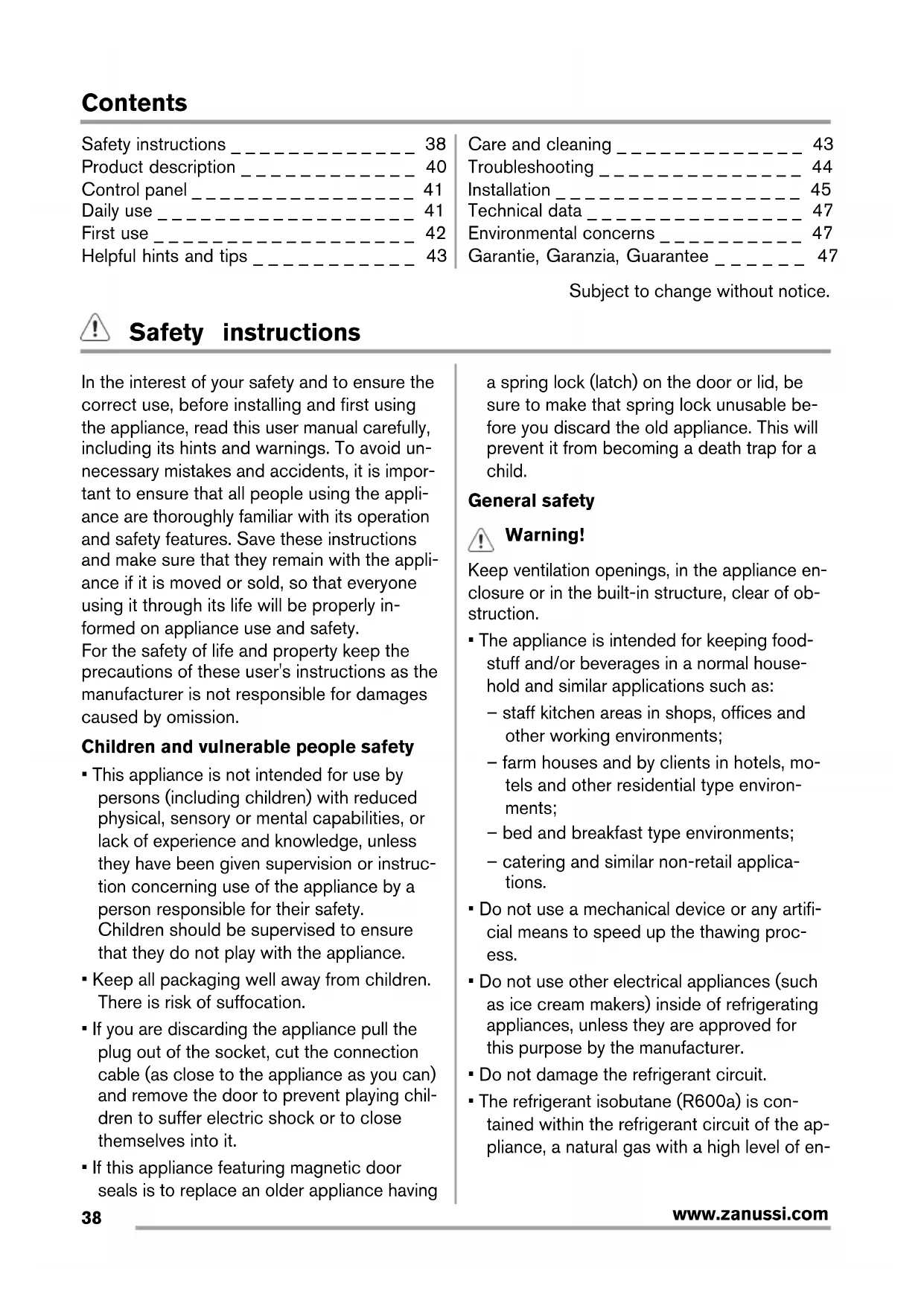 www.zanussi.comContents Safety instructions _ _ _ _ _ _ _ _ _ _ _ _ _ 38 Product description _ _ _ _ _ _ _ _ _ _ _ _ 40 Control panel _ _ _ _ _ _ _ _ _ _ _ _ _ _ _ _ 41 Daily use _ _ _ _ _ _ _ _ _ _ _ _ _ _ _ _ _ _ 41 First use _ _ _ _ _ _ _ _ _ _ _ _ _ _ _ _ _ _ 42 Helpful hints and tips _ _ _ _ _ _ _ _ _ _ _ 43 Care and cleaning _ _ _ _ _ _ _ _ _ _ _ _ _ 43 Troubleshooting _ _ _ _ _ _ _ _ _ _ _ _ _ _ 44 Installation _ _ _ _ _ _ _ _ _ _ _ _ _ _ _ _ _ 45 Technical data _ _ _ _ _ _ _ _ _ _ _ _ _ _ _ 47 Environmental concerns _ _ _ _ _ _ _ _ _ _ 47 Garantie, Garanzia, Guarantee _ _ _ _ _ _ 47 Subject to change without notice. Safety instructions In the interest of your safety and to ensure the correct use, before installing and first using the appliance, read this user manual carefully, including its hints and warnings. To avoid un- necessary mistakes and accidents, it is impor- tant to ensure that all people using the appli- ance are thoroughly familiar with its operation and safety features. Save these instructions and make sure that they remain with the appli- ance if it is moved or sold, so that everyone using it through its life will be properly in- formed on appliance use and safety. For the safety of life and property keep the precautions of these user's instructions as the manufacturer is not responsible for damages caused by omission. Children and vulnerable people safety