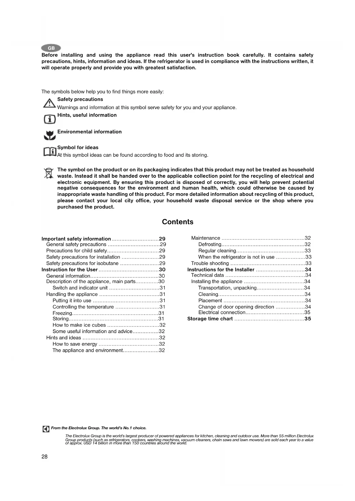 - Before installing and using the appliance read this user's instruction book carefully. It contains safety precautions, hints, information and ideas. If the refrigerator is used in compliance with the instructions written, it will operate properly and provide you with greatest satisfaction. The symbols below help you to find things more easily: Safety precautions Warnings and information at this symbol serve safety for you and your appliance. Hints, useful information Environmental information Symbol for ideas At this symbol ideas can be found according to food and its storing. The symbol on the product or on its packaging indicates that this product may not be treated as household waste. Instead it shall be handed over to the applicable collection point for the recycling of electrical and electronic equipment. By ensuring this product is disposed of correctly, you will help prevent potential negative consequences for the environment and human health, which could otherwise be caused by inappropriate waste handling of this product. For more detailed information about recycling of this product, please contact your local city office, your household waste disposal service or the shop where you purchased the product. From the Electrolux Group. The world’s No.1 choice. The Electrolux Group is the world's largest producer of powered appliances for kitchen, cleaning and outdoor use. More than 55 million Electrolux Group products (such as refrigerators, cookers, washing machines, vacuum cleaners, chain saws and lawn mowers) are sold each year to a value of approx. USD 14 billion in more than 150 countries around the world. Important safety information p. 29