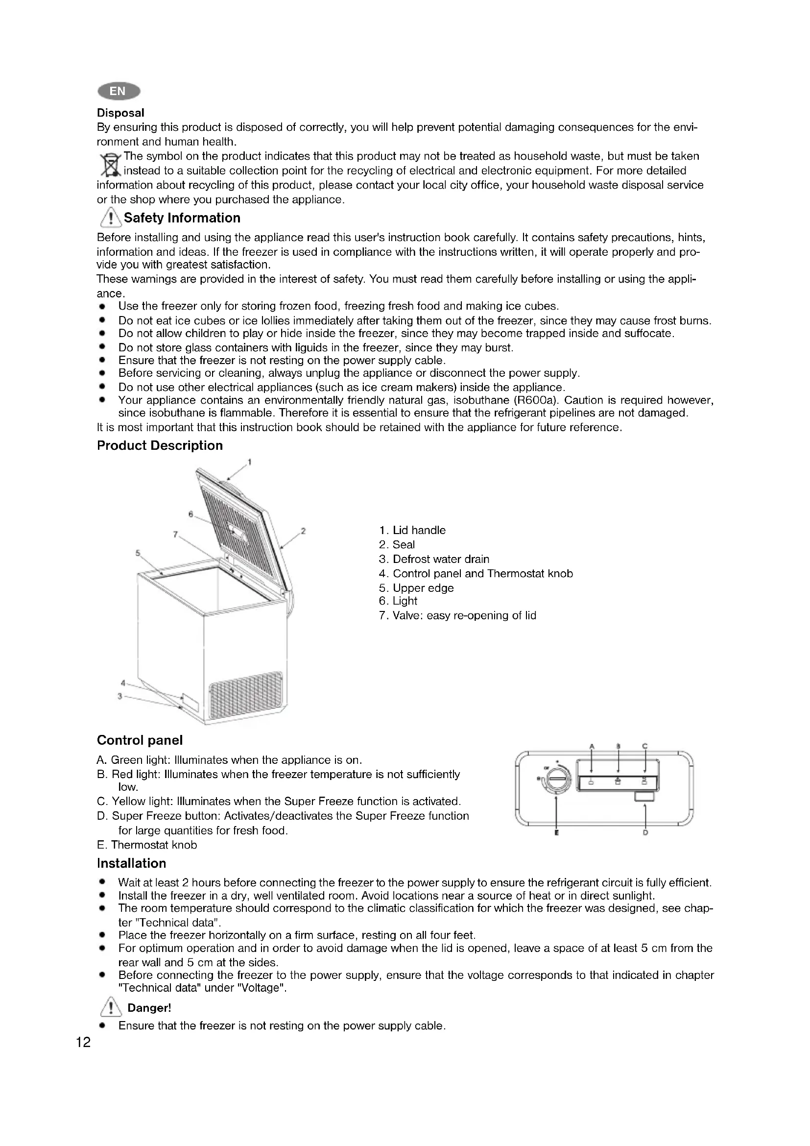 Disposal By ensuring this product is disposed of correctly, you will help prevent potential damaging consequences for the envi- ronment and human health. The symbol on the product indicates that this product may not be treated as household waste, but must be taken instead to a suitable collection point for the recycling of electrical and electronic equipment. For more detailed information about recycling of this product, please contact your local city office, your household waste disposal service or the shop where you purchased the appliance. Safety Information Before installing and using the appliance read this user's instruction book carefully. It contains safety precautions, hints, information and ideas. If the freezer is used in compliance with the instructions written, it will operate properly and pro- vide you with greatest satisfaction. These warnings are provided in the interest of safety. You must read them carefully before installing or using the appli- ance. Use the freezer only for storing frozen food, freezing fresh food and making ice cubes. Do not eat ice cubes or ice lollies immediately after taking them out of the freezer, since they may cause frost burns. Do not allow children to play or hide inside the freezer, since they may become trapped inside and suffocate. Do not store glass containers with liguids in the freezer, since they may burst. Ensure that the freezer is not resting on the power supply cable. Before servicing or cleaning, always unplug the appliance or disconnect the power supply. Do not use other electrical appliances (such as ice cream makers) inside the appliance. Your appliance contains an environmentally friendly natural gas, isobuthane (R600a). Caution is required however, since isobuthane is flammable. Therefore it is essential to ensure that the refrigerant pipelines are not damaged. It is most important that this instruction book should be retained with the appliance for future reference. Product Description Control panel A. Green light: Illuminates when the appliance is on. B. Red light: Illuminates when the freezer temperature is not sufficiently low. C. Yellow light: Illuminates when the Super Freeze function is activated. D. Super Freeze button: Activates/deactivates the Super Freeze function for large quantities for fresh food. E. Thermostat knob Installation Wait at least 2 hours before connecting the freezer to the power supply to ensure the refrigerant circuit is fully efficient. Install the freezer in a dry, well ventilated room. Avoid locations near a source of heat or in direct sunlight. The room temperature should correspond to the climatic classification for which the freezer was designed, see chap- ter "Technical data". Place the freezer horizontally on a firm surface, resting on all four feet. For optimum operation and in order to avoid damage when the lid is opened, leave a space of at least 5 cm from the rear wall and 5 cm at the sides. Before connecting the freezer to the power supply, ensure that the voltage corresponds to that indicated in chapter "Technical data" under "Voltage". Danger! Ensure that the freezer is not resting on the power supply cable.