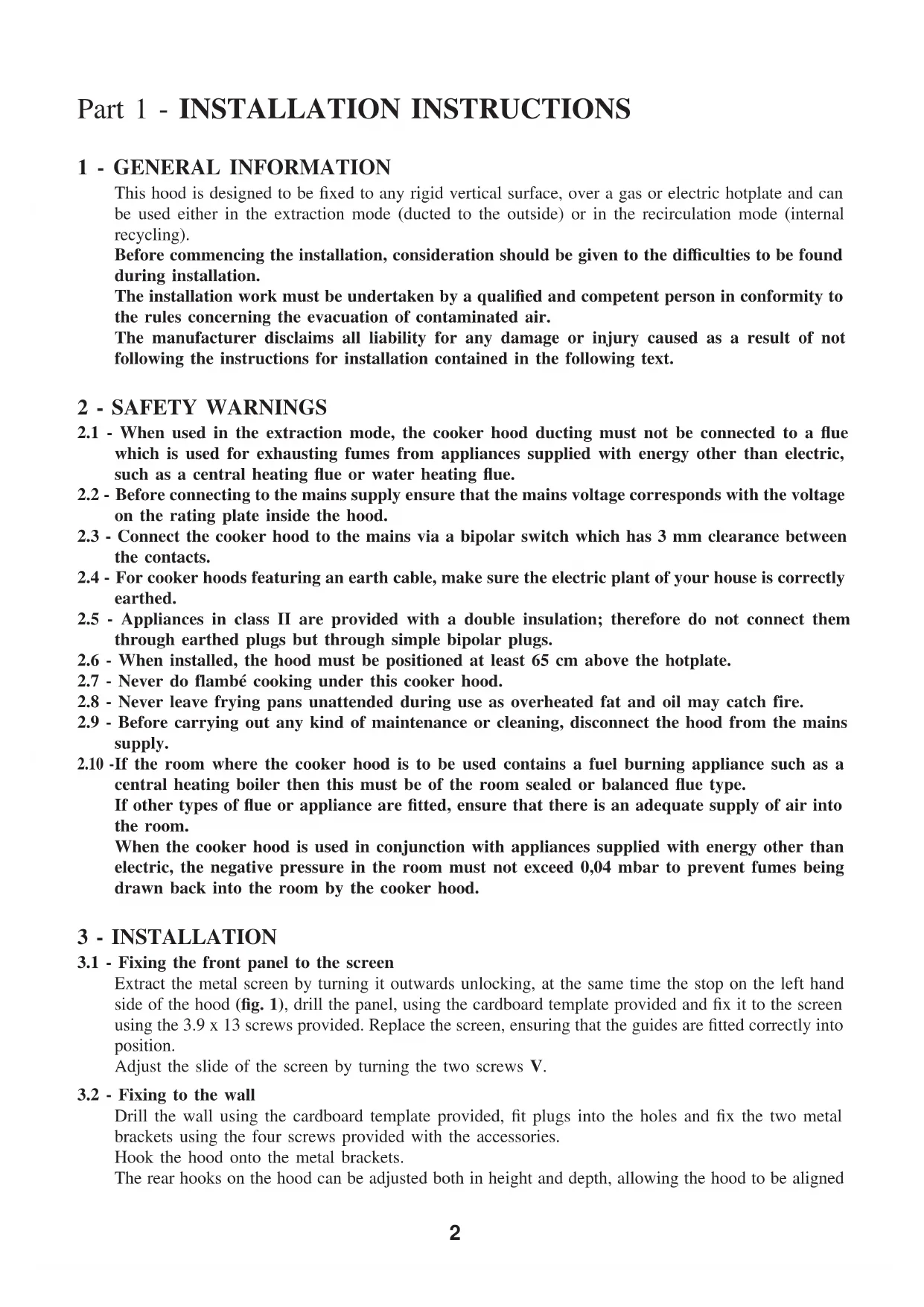 This hood is designed to be fixed to any rigid vertical surface, over a gas or electric hotplate and can be used either in the extraction mode (ducted to the outside) or in the recirculation mode (internal recycling). Before commencing the installation, consideration should be given to the difficulties to be found during installation. The installation work must be undertaken by a qualified and competent person in conformity to the rules concerning the evacuation of contaminated air. The manufacturer disclaims all liability for any damage or injury caused as a result of not following the instructions for installation contained in the following text.