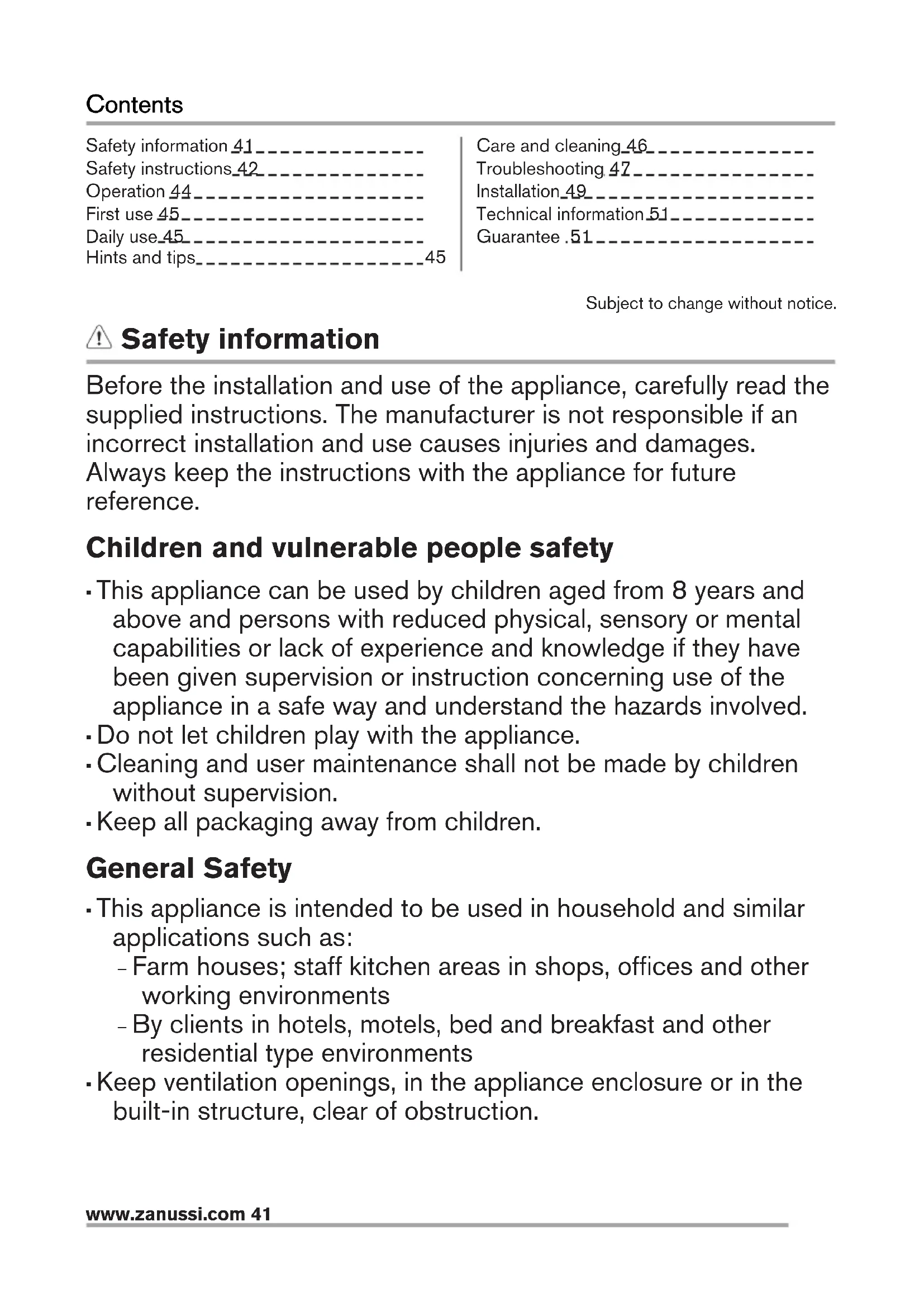 Care and cleaning 46 Troubleshooting 47 Installation 49 Technical information 51 Guarantee 51 Subject to change without notice. Safety information Before the installation and use of the appliance, carefully read the supplied instructions. The manufacturer is not responsible if an incorrect installation and use causes injuries and damages. Always keep the instructions with the appliance for future reference. Children and vulnerable people safety