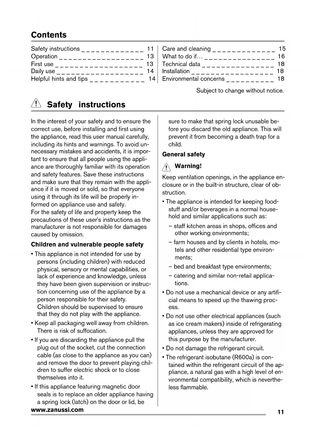 www.zanussi.comContents Safety instructions _ _ _ _ _ _ _ _ _ _ _ _ _ 11 Operation _ _ _ _ _ _ _ _ _ _ _ _ _ _ _ _ _ _ 13 First use _ _ _ _ _ _ _ _ _ _ _ _ _ _ _ _ _ _ 13 Daily use _ _ _ _ _ _ _ _ _ _ _ _ _ _ _ _ _ _ 14 Helpful hints and tips _ _ _ _ _ _ _ _ _ _ _ 14 Care and cleaning _ _ _ _ _ _ _ _ _ _ _ _ _ 15 What to do if… _ _ _ _ _ _ _ _ _ _ _ _ _ _ _ 16 Technical data _ _ _ _ _ _ _ _ _ _ _ _ _ _ _ 18 Installation _ _ _ _ _ _ _ _ _ _ _ _ _ _ _ _ _ 18 Environmental concerns _ _ _ _ _ _ _ _ _ _ 18 Subject to change without notice. Safety instructions In the interest of your safety and to ensure the correct use, before installing and first using the appliance, read this user manual carefully, including its hints and warnings. To avoid un- necessary mistakes and accidents, it is impor- tant to ensure that all people using the appli- ance are thoroughly familiar with its operation and safety features. Save these instructions and make sure that they remain with the appli- ance if it is moved or sold, so that everyone using it through its life will be properly in- formed on appliance use and safety. For the safety of life and property keep the precautions of these user's instructions as the manufacturer is not responsible for damages caused by omission. Children and vulnerable people safety