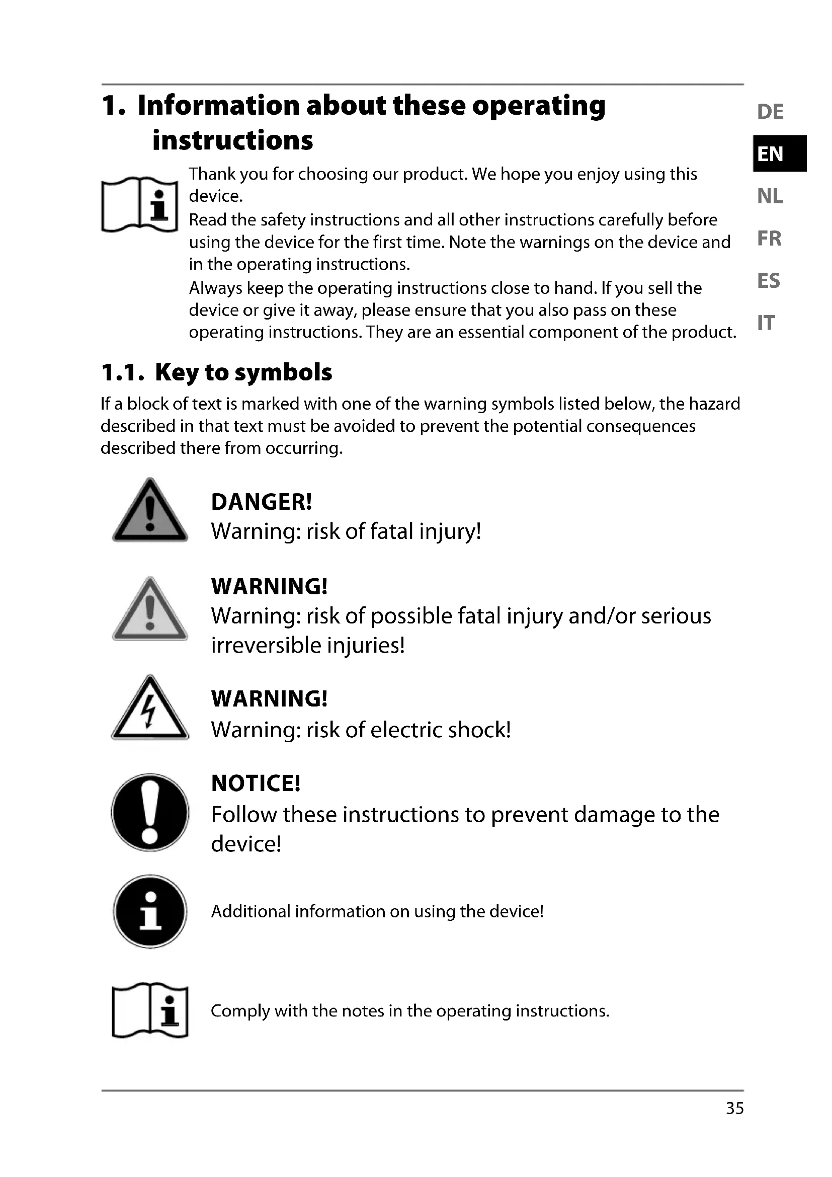 instructions Thank you for choosing our product. We hope you enjoy using this device. Read the safety instructions and all other instructions carefully before using the device for the first time. Note the warnings on the device and in the operating instructions. Always keep the operating instructions close to hand. If you sell the device or give it away, please ensure that you also pass on these operating instructions. They are an essential component of the product. 1.1. Key to symbols If a block of text is marked with one of the warning symbols listed below, the hazard described in that text must be avoided to prevent the potential consequences described there from occurring. DANGER!