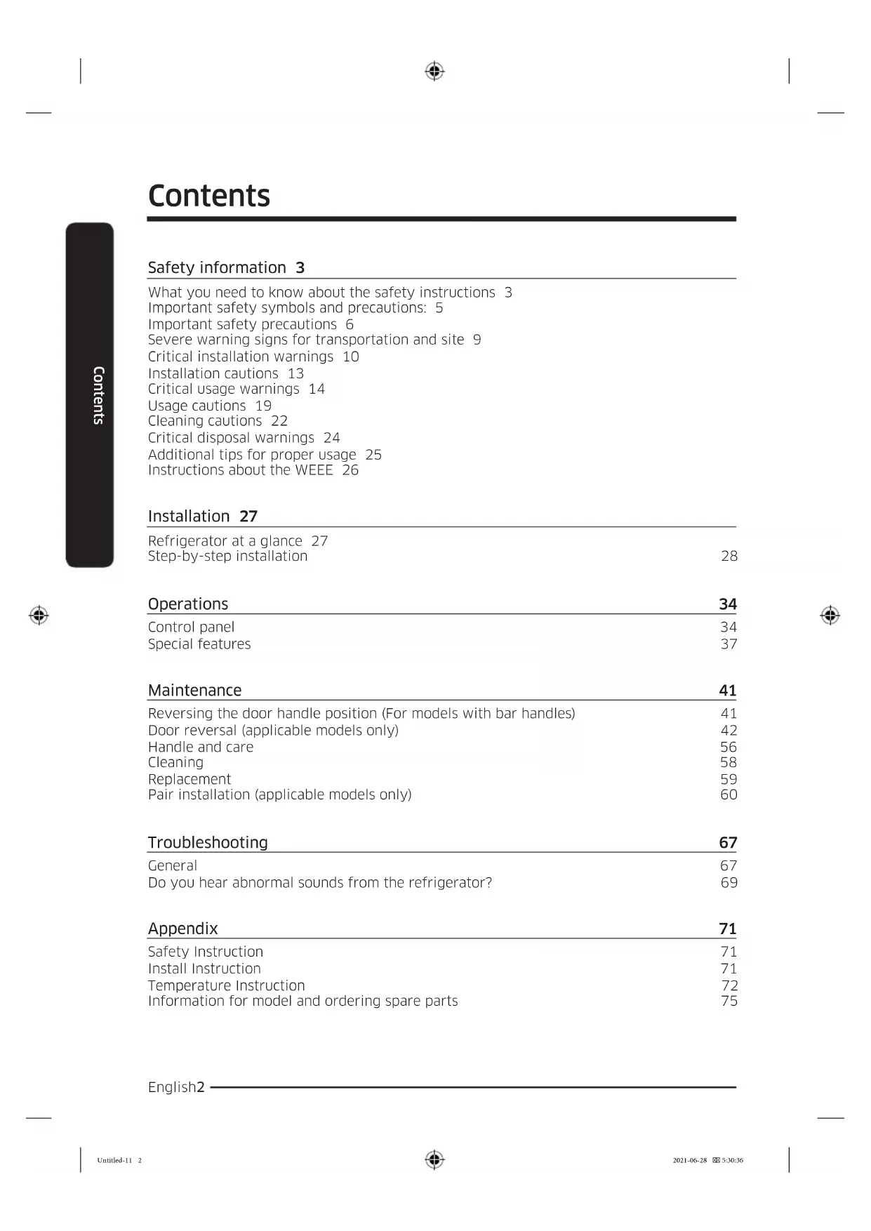 Refrigerator User manual RB3*T*/RL3*T*/RB3*A*/RL3*A* SESG/SEAG Free Standing Appliance Untitled-11 1 2021-06-28 5:30:36English2 Contents Contents Safety information 3 What you need to know about the safety instructions 3 Important safety symbols and precautions: 5 Important safety precautions 6 Severe warning signs for transportation and site 9 Critical installation warnings 10 Installation cautions 13 Critical usage warnings 14 Usage cautions 19 Cleaning cautions 22 Critical disposal warnings 24 Additional tips for proper usage 25 Instructions about the WEEE 26 Installation 27 Refrigerator at a glance 27 Step-by-step installation 28 Operations 34 Control panel 34 Special features 37 Maintenance 41 Reversing the door handle position (For models with bar handles) 41 Door reversal (applicable models only) 42 Handle and care 56 Cleaning 58 Replacement 59 Pair installation (applicable models only) 60 Troubleshooting 67 General 67 Do you hear abnormal sounds from the refrigerator? 69
