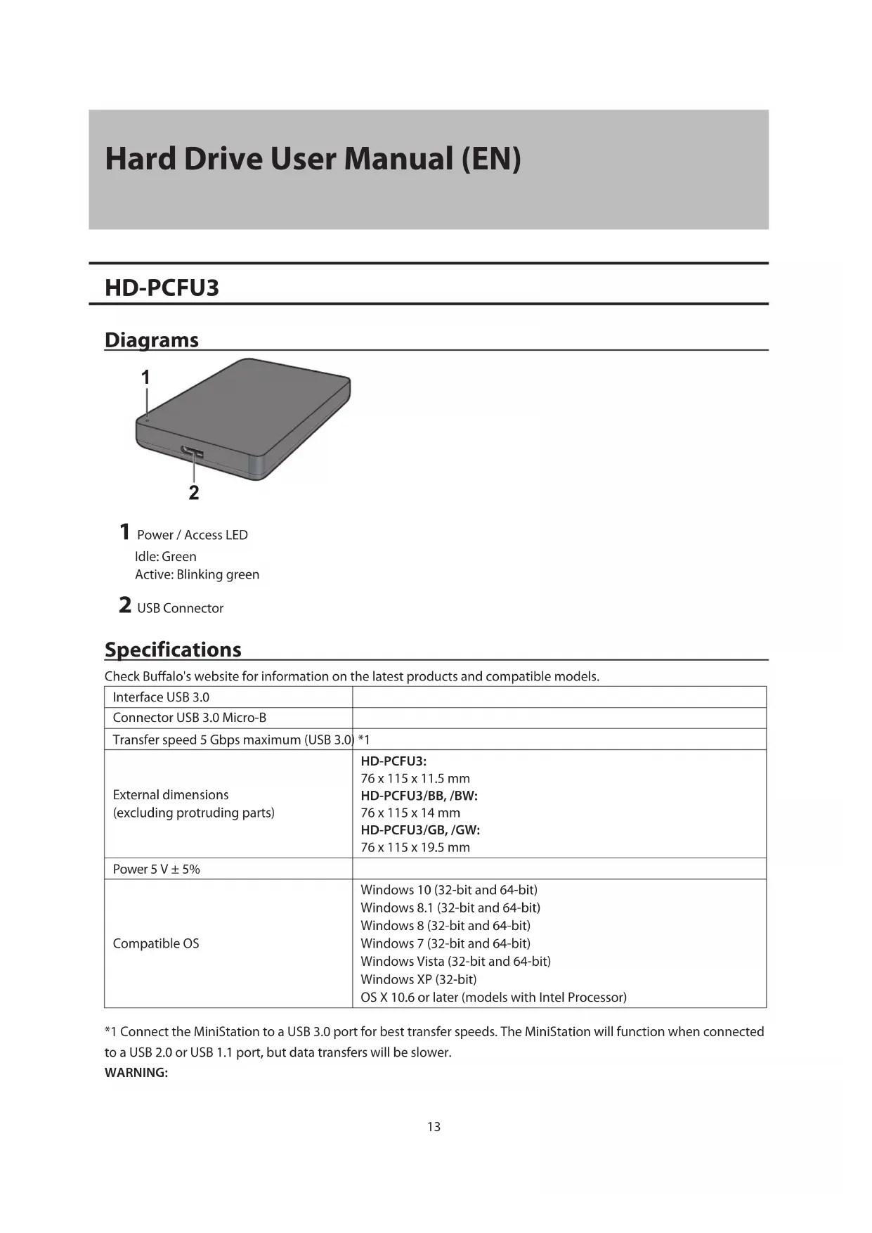 1 Power / Access LED Idle: Green Active: Blinking green 2 USB Connector Specifications Check Buffalo's website for information on the latest products and compatible models. Interface USB 3.0 Connector USB 3.0 Micro-B Transfer speed 5 Gbps maximum (USB 3.0) *1 External dimensions (excluding protruding parts) HD-PCFU3: 76 x 115 x 11.5 mm HD-PCFU3/BB, /BW: 76 x 115 x 14 mm HD-PCFU3/GB, /GW: 76 x 115 x 19.5 mm Power 5 V ± 5% Compatible OS Windows 10 (32-bit and 64-bit) Windows 8.1 (32-bit and 64-bit) Windows 8 (32-bit and 64-bit) Windows 7 (32-bit and 64-bit) Windows Vista (32-bit and 64-bit) Windows XP (32-bit) OS X 10.6 or later (models with Intel Processor) *1 Connect the MiniStation to a USB 3.0 port for best transfer speeds. The MiniStation will function when connected to a USB 2.0 or USB 1.1 port, but data transfers will be slower.