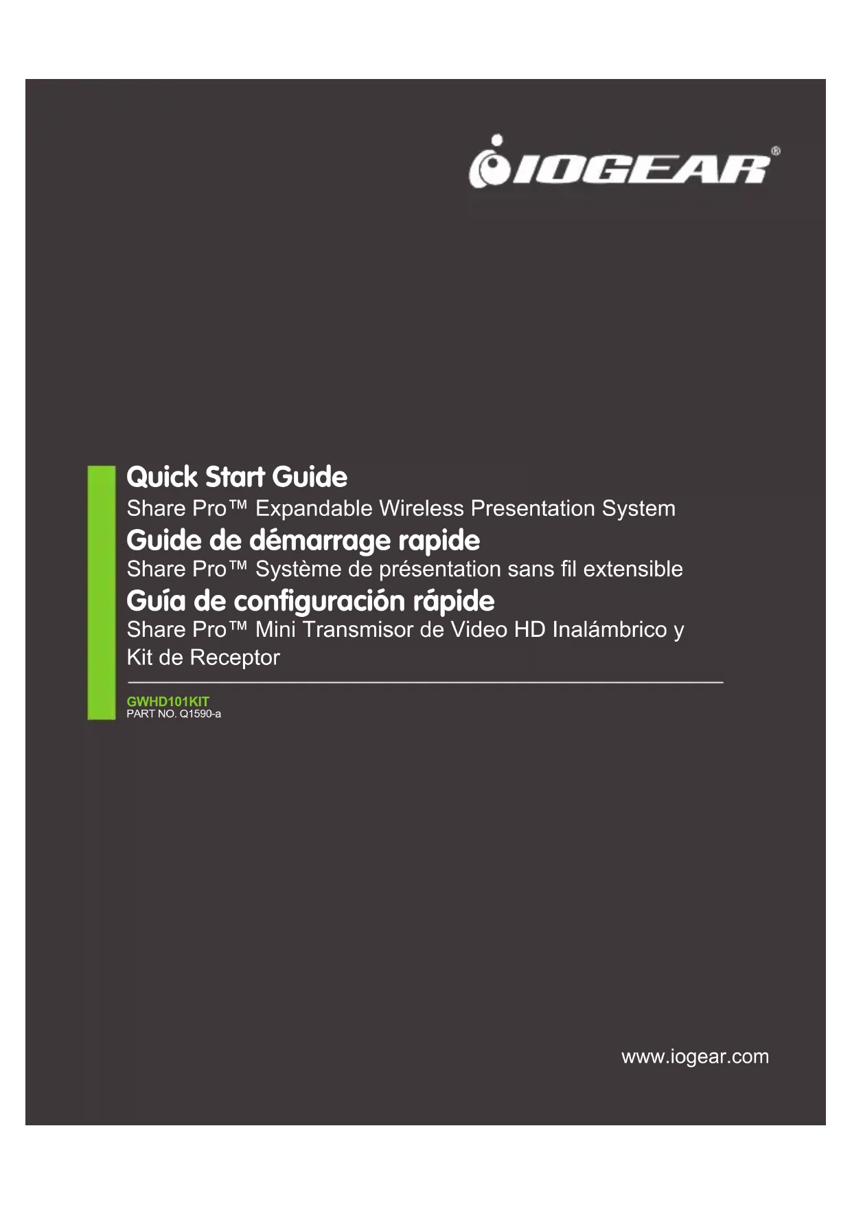 GWHD101KIT PART NO. Q1590-a www.iogear.com STEP 1 Turn on both the video source and the display (TV or projector). Make sure that the input source on your display corresponds to the HDMI port that the transmitter is connected to. STEP 2 Insert the transmitter into the HDMI port of your video source device. Quick Start Guide Share Pro™ Expandable Wireless Presentation System Guide de démarrage rapide Share Pro™ Système de présentation sans fil extensible Guía de configuración rápide Share Pro™ Mini Transmisor de Video HD Inalámbrico y Kit de Receptor STEP 3 Use one of the USB charging cables to connect to the micro USB port of the transmitter to a type USB-A port on the source device to obtain power. In a rare case that the source device has no USB port, please use a 5V USB power adapter with a minimum of 500mA output (not included in the package). At this time both the power LED (blue) and the wireless LED (red) will light up solid and then the wireless LED (red) will go out and come back on and both will remain solid. In case the space around the HDMI port is too tight or the position is too awkward and could cause a connection issue, use the HDMI cable extender or the 90 degree HDMI adapter included in the package to correct this issue or to increase the spacing. STEP 4 Connect the receiver into a free HDMI port of your video display device (TV, projector, etc.) using the provided HDMI cable and switch your TV Input to the HDMI input source it is connected to. STEP 5 The connection LED (green) will come on solid and a message will be displayed on your TV/projector stating it is waiting for connection. After approximately 30 seconds the wireless LED (green) the receiver will come on, the connection LED on the receiver will start to blink once every second. The transmitter wireless LED (red) will also blink every second. The connection is now established. The LED around the transmitter swtich button will also turn from red to blue. For the next transmitter to be connected to the receiver, simply press the transmitter button and the red LED will turn to blue and the previously connected transmitter LED will change from blue LED to red indicating that the transmitter is now disconnected. STEP 6 Video from your source device will now be duplicated on your TV/projector. NOTE: We recommend that this device is used for line-of-sight only as it is designed as a short range device.1 2 x Mini wireless transmitters 1 x Wireless receiver 1 x HDMI cable 2 x HDMI cable extender 2 x 90° HDMI adapter 2 x USB-A male-to-USB micro power cables 1 x 5V Wall mount power adapter with barrel connector 1 x Quick Start Guide 1 x Warranty Card STEP 1 Turn on both the video source and the display (TV or projector). Make sure that the input source on your display corresponds to the HDMI port that the transmitter is connected to. STEP 2 Insert the transmitter into the HDMI port of your video source device. Package Contents 1 HDMI source device (DVD, PS3, Satellite box, PC etc.) with USB-A connector that carries power (and not used as a firmware upgrade port) 1 HDMI display device (HDTV, projector with HDMI port, etc.) Note: In the case that there is no USB-A port that supplies power to the transmitters, please use a USB power supply with minimum 500mA. System Requirements STEP 3 Use one of the USB charging cables to connect to the micro USB port of the transmitter to a type USB-A port on the source device to obtain power. In a rare case that the source device has no USB port, please use a 5V USB power adapter with a minimum of 500mA output (not included in the package). At this time both the power LED (blue) and the wireless LED (red) will light up solid and then the wireless LED (red) will go out and come back on and both will remain solid. In case the space around the HDMI port is too tight or the position is too awkward and could cause a connection issue, use the HDMI cable extender or the 90 degree HDMI adapter included in the package to correct this issue or to increase the spacing. STEP 4 Connect the receiver into a free HDMI port of your video display device (TV, projector, etc.) using the provided HDMI cable and switch your TV Input to the HDMI input source it is connected to. STEP 5 The connection LED (green) will come on solid and a message will be displayed on your TV/projector stating it is waiting for connection. After approximately 30 seconds the wireless LED (green) the receiver will come on, the connection LED on the receiver will start to blink once every second. The transmitter wireless LED (red) will also blink every second. The connection is now established. The LED around the transmitter swtich button will also turn from red to blue. For the next transmitter to be connected to the receiver, simply press the transmitter button and the red LED will turn to blue and the previously connected transmitter LED will change from blue LED to red indicating that the transmitter is now disconnected. STEP 6 Video from your source device will now be duplicated on your TV/projector. NOTE: We recommend that this device is used for line-of-sight only as it is designed as a short range device.D BA C