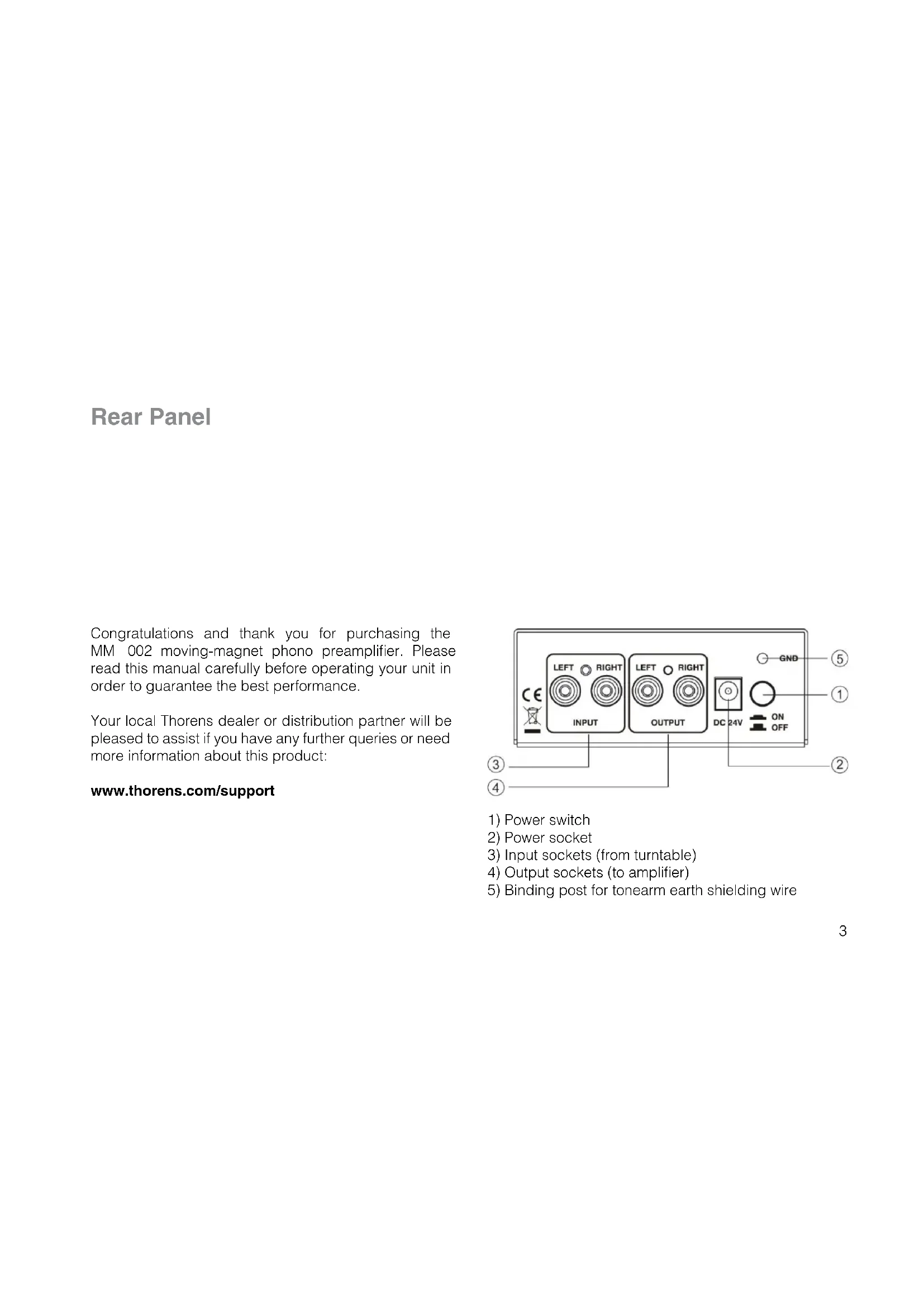 ANSCHLÜSSE 7 INBETRIEBNAHME 8 TECHNISCHE DATEN 10 Inhalt Sommaire3 Rear Panel Congratulations and thank you for purchasing the MM 002 moving-magnet phono preamplifier. Please read this manual carefully before operating your unit in order to guarantee the best performance. Your local Thorens dealer or distribution partner will be pleased to assist if you have any further queries or need more information about this product: www.thorens.com/support