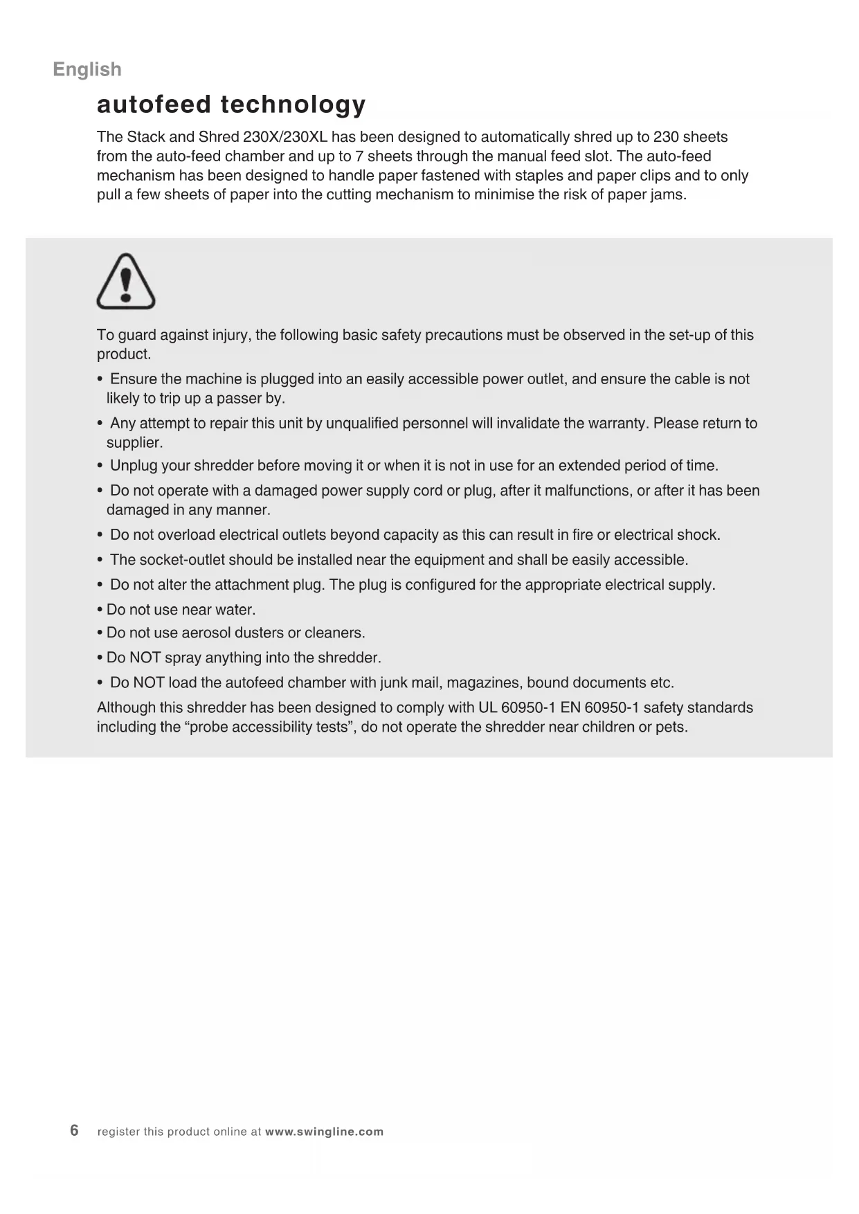 - Do NOT load the autofeed chamber with junk mail, magazines, bound documents etc. Although this shredder has been designed to comply with UL 60950-1 EN 60950-1 safety standards including the “probe accessibility tests”, do not operate the shredder near children or pets. EnglishSTACK-AND-SHRED 230X&230XL
