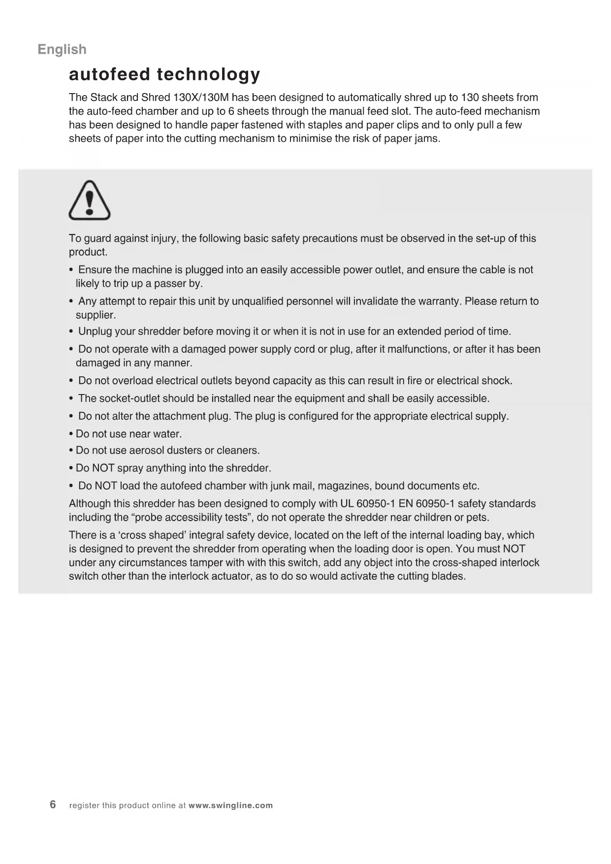 English instruction manual 6 Francais manuel d’utilisation 12 Español manual de instrucciones 18 Português manual de instruções 246 register this product online at www.swingline.com autofeed technology The Stack and Shred 130X/130M has been designed to automatically shred up to 130 sheets from the auto-feed chamber and up to 6 sheets through the manual feed slot. The auto-feed mechanism has been designed to handle paper fastened with staples and paper clips and to only pull a few sheets of paper into the cutting mechanism to minimise the risk of paper jams. To guard against injury, the following basic safety precautions must be observed in the set-up of this product.