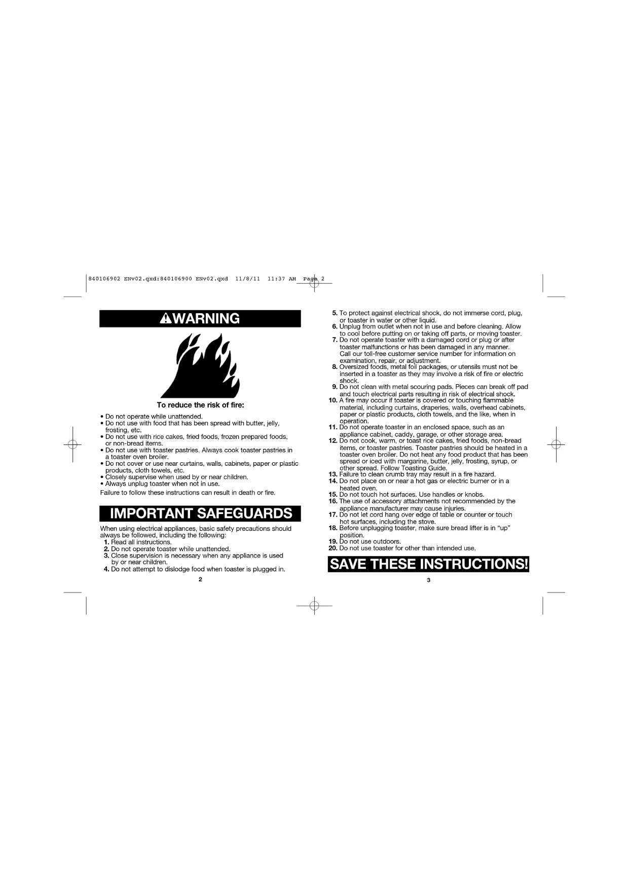20. Do not use toaster for other than intended use.