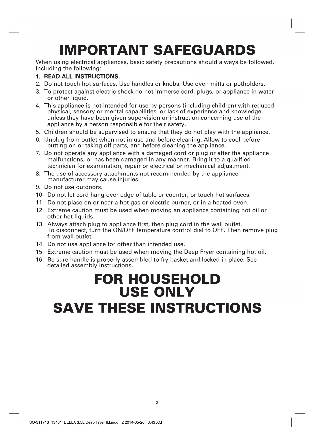 SO-311713_13401_BELLA 3.5L Deep Fryer IM.indd 2 2014-05-26 8:43 AM3 ADDITIONAL IMPORTANT SAFEGUARDS CAUTION, HOT SURFACES: This appliance generates heat and escaping steam during use. Proper precautions must be taken to prevent the risk of burns, res, or other injury to persons or damage to property. CAUTION: This appliance is hot during operation and retains heat for some time after turning OFF. Always use oven mitts when handling hot materials and allow metal parts to cool before cleaning. Do not place anything on top of the appliance while it is operating or while it is hot.