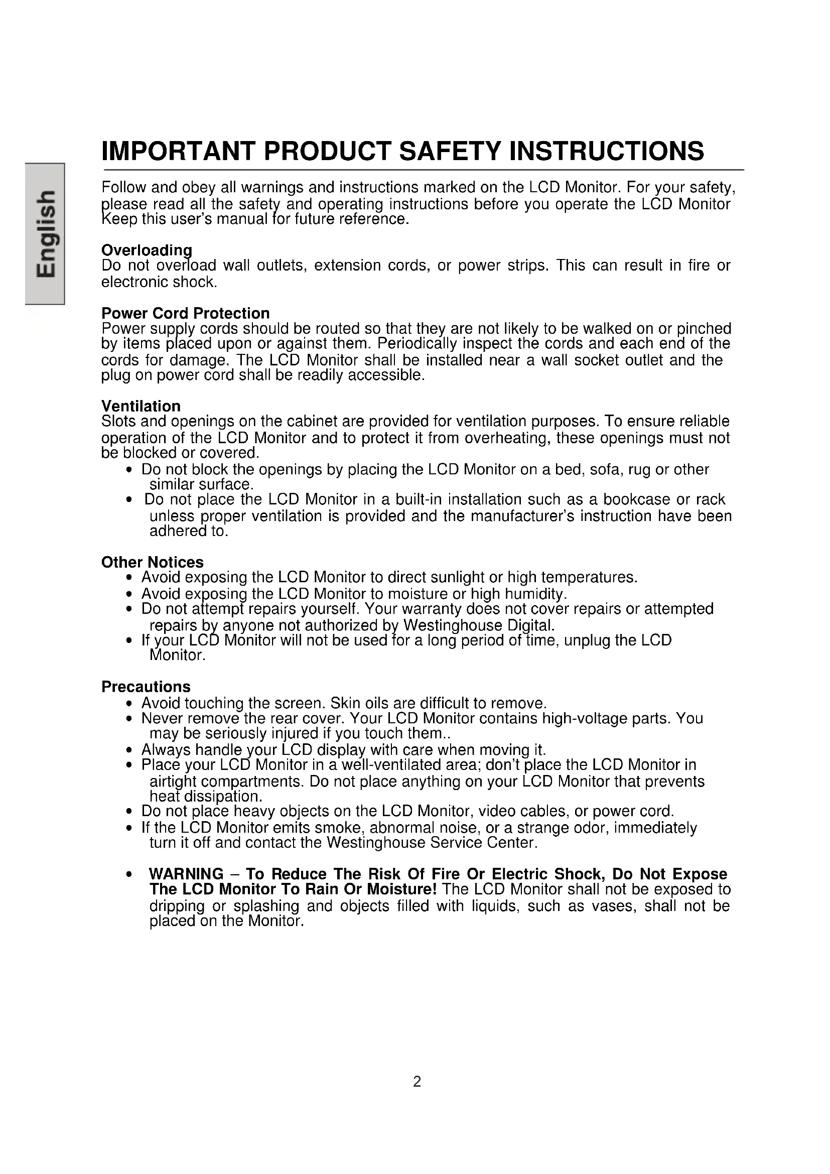 - If the LCD Monitor emits smoke, abnormal noise, or a strange odor, immediately turn it off and contact the Westinghouse Service Center.