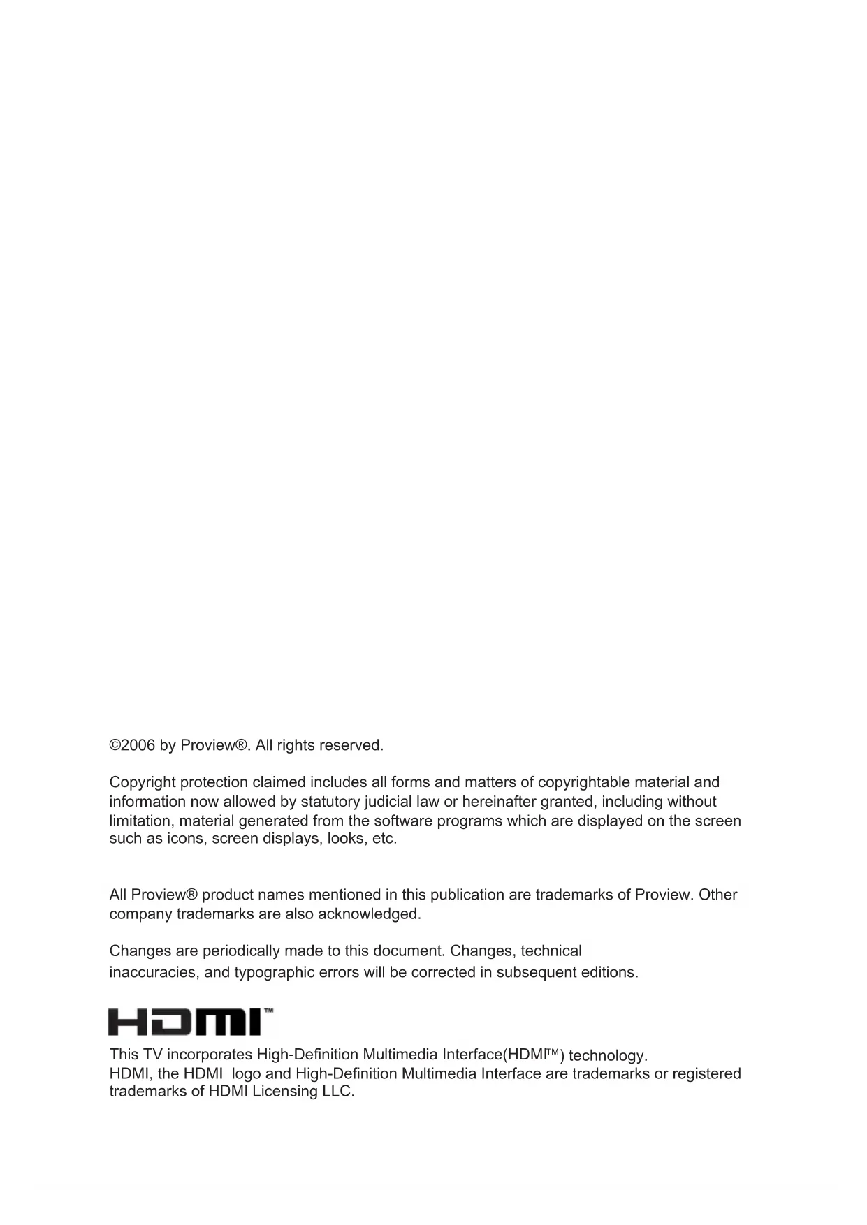 ©2006 by Proview®. All rights reserved. Copyright protection claimed includes all forms and matters of copyrightable material and information now allowed by statutory judicial law or hereinafter granted, including without limitation, material generated from the software programs which are displayed on the screen such as icons, screen displays, looks, etc. All Proview® product names mentioned in this publication are trademarks of Proview. Other company trademarks are also acknowledged. Changes are periodically made to this document. Changes, technical inaccuracies, and typographic errors will be corrected in subsequent editions. This TV incorporates High-Definition Multimedia Interface(HDMI
